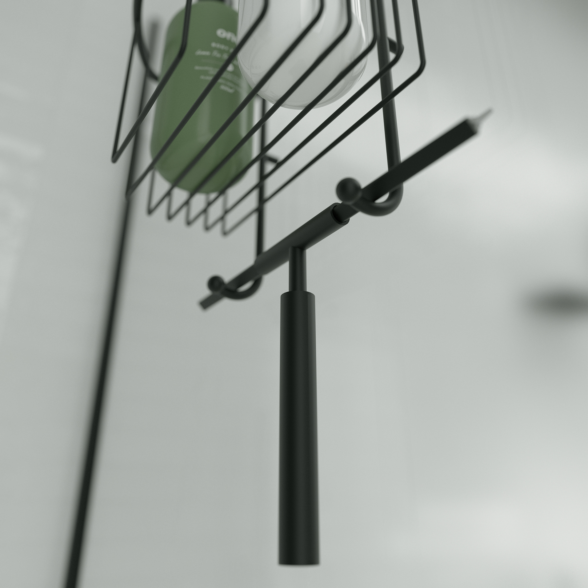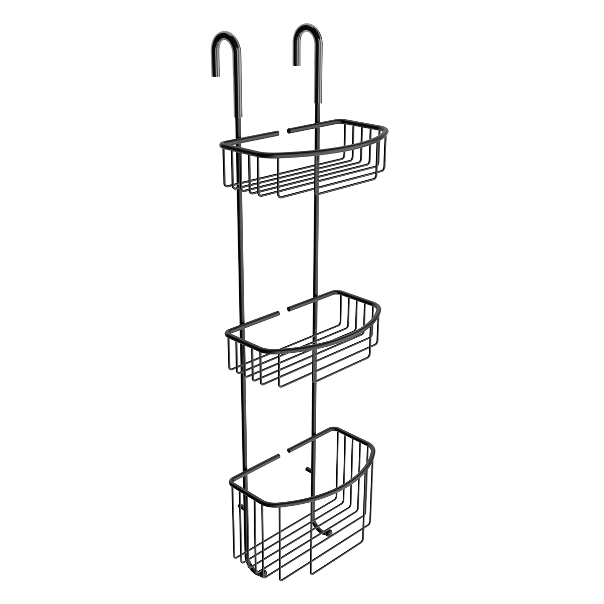 Black wire shelf with three wire baskets to be hung in the shower.