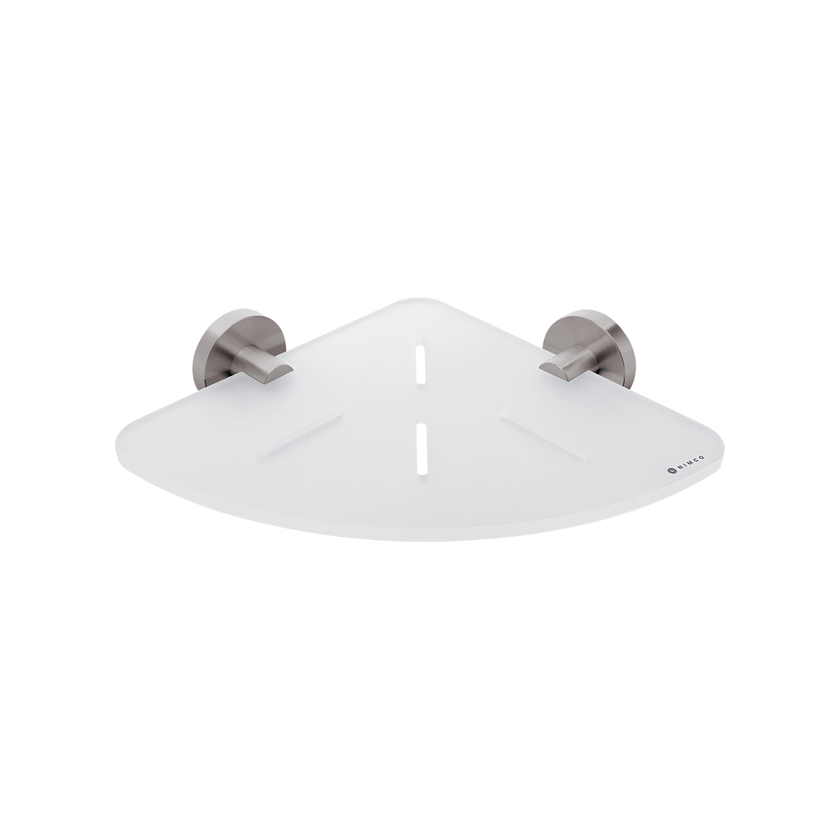 Corner shelf with milling made of plexiglass. Holders made of brushed stainless steel.