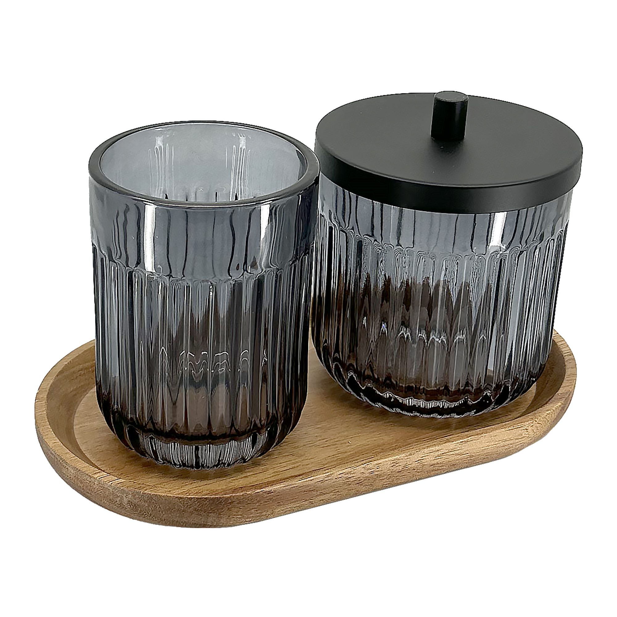 Container for cosmetic pads made of translucent black glass with a glossy finish.