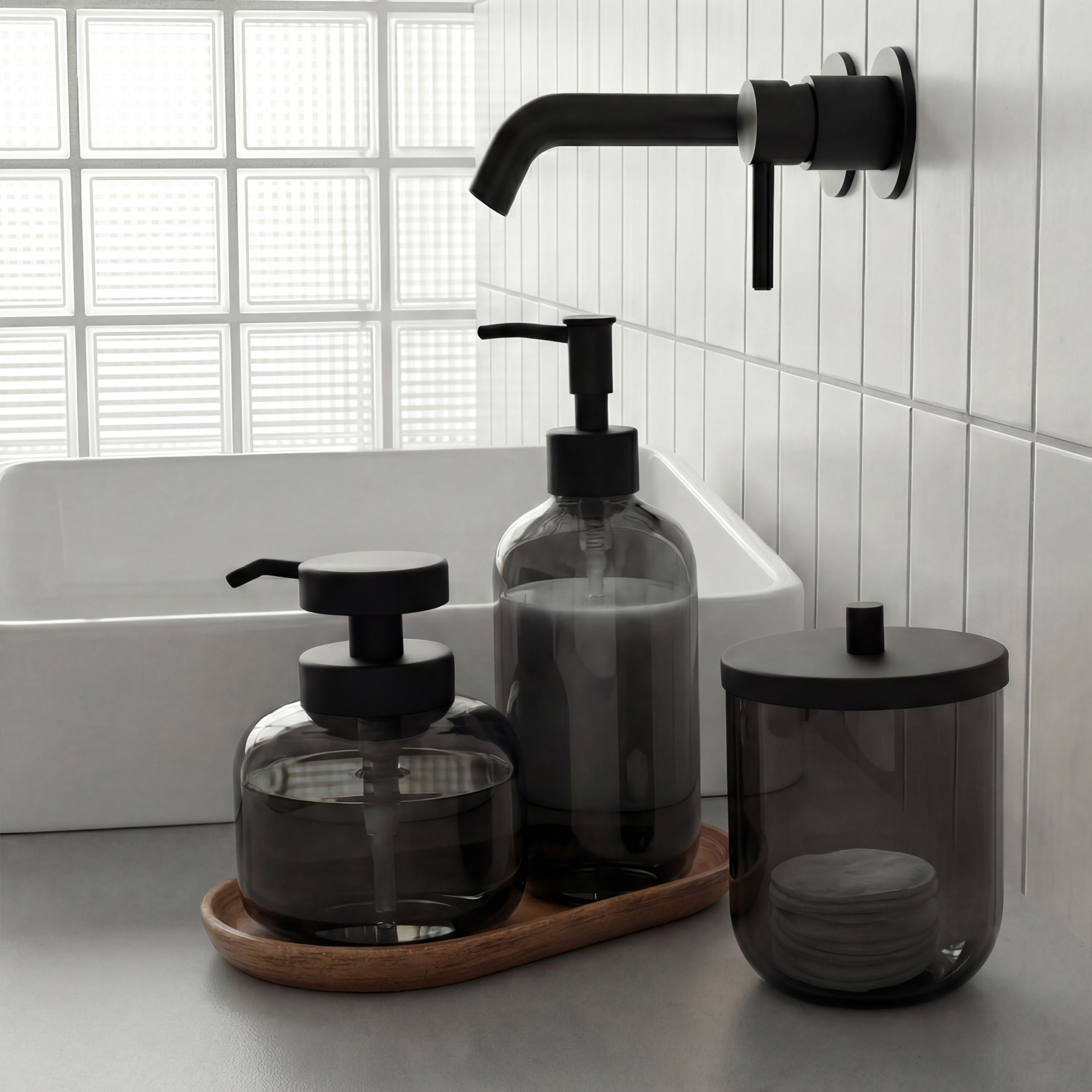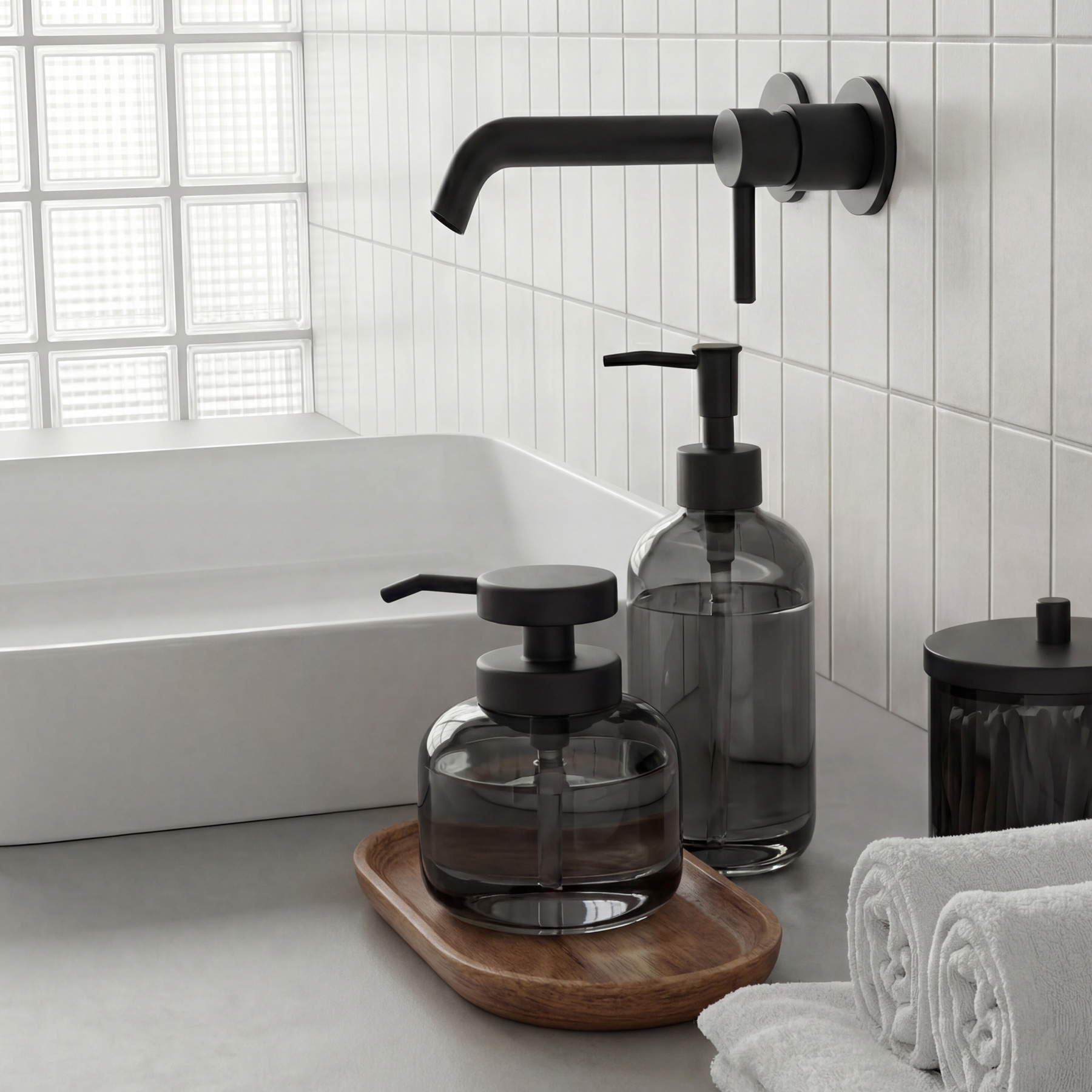 Liquid soap dispenser made of translucent black glass with a glossy finish. Plastic pump in matte black. Capacity 370 ml.
