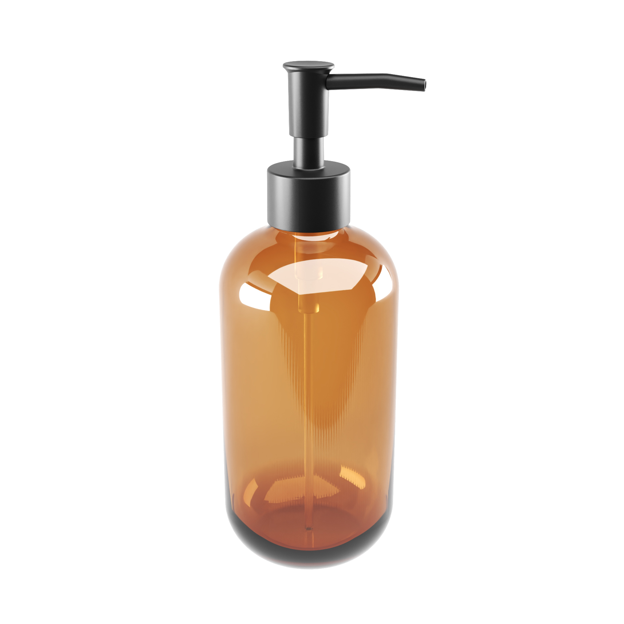 Liquid soap dispenser made of translucent brown glass with a glossy finish. Plastic pump in matte black. Capacity 370 ml.