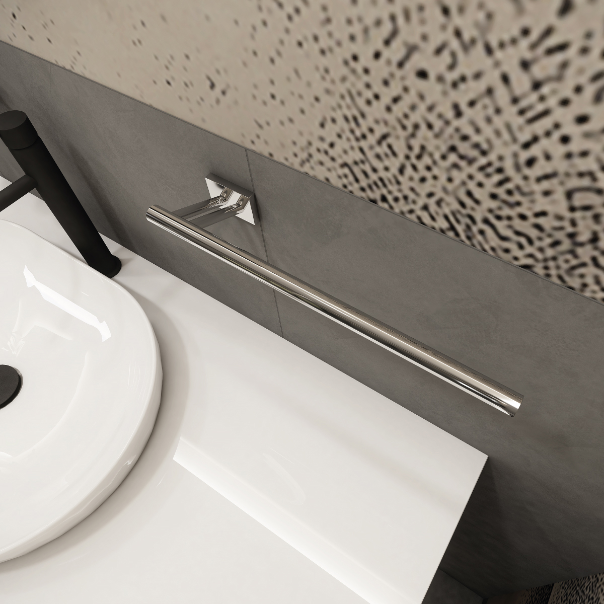 Right towel holder, assembled to wall. Made of brass, chrome surface finish.