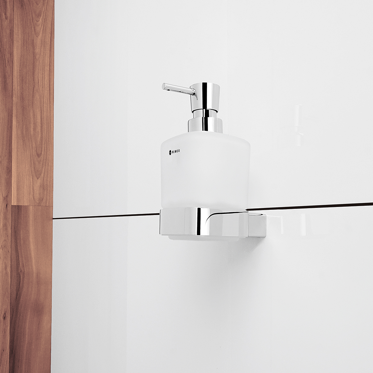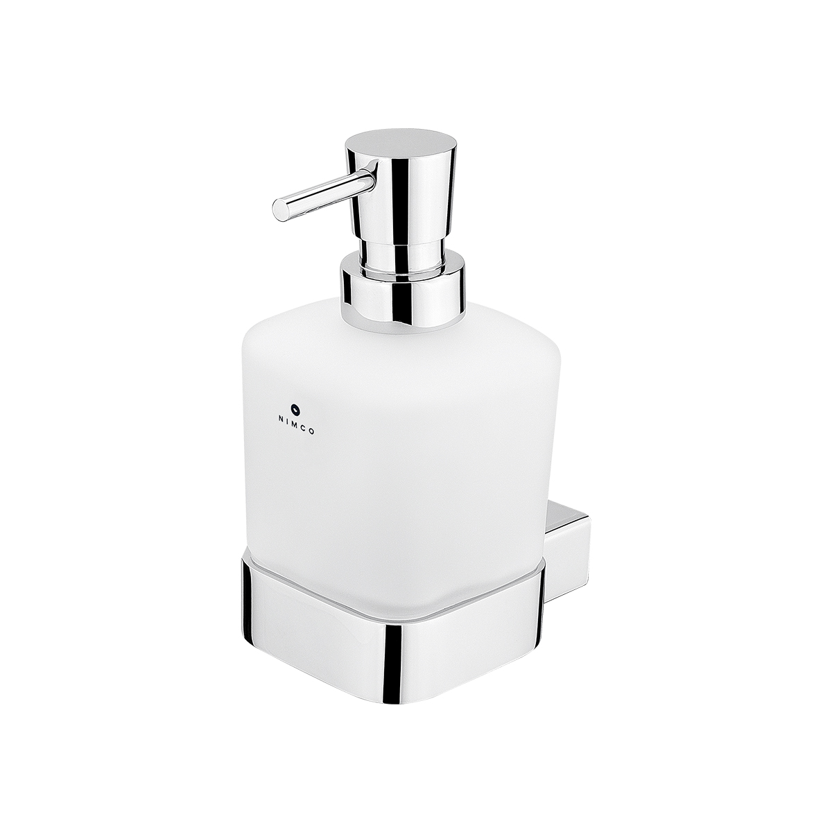 Soap dispenser. Brass pump and holder / chrome. Container made of satin glass, 300 ml.