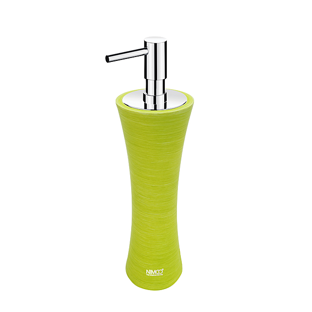 Soap dispenser made of polyresin with chrome plated plastic pump.