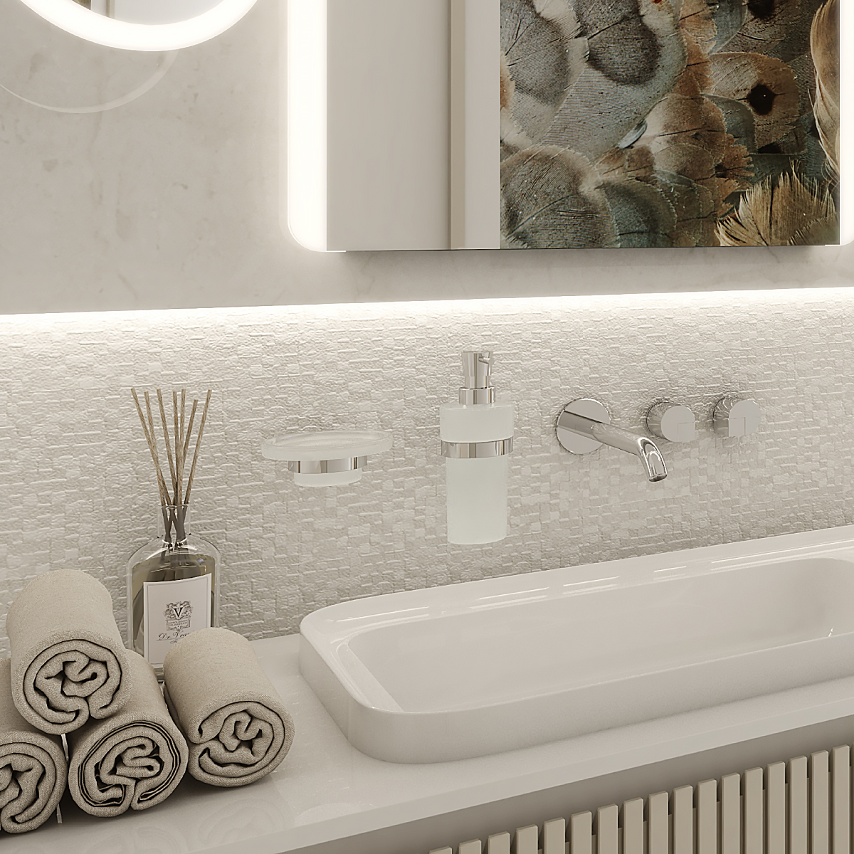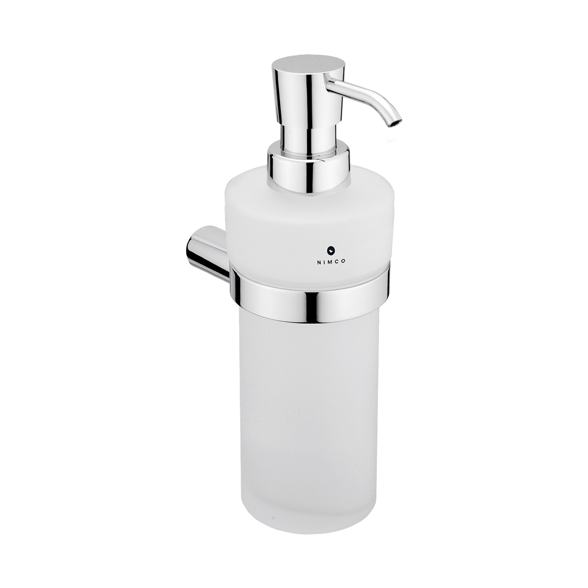 Soap dispenser. Plastic pump with chrome surface finish. Container made of satin glass, 250 ml.