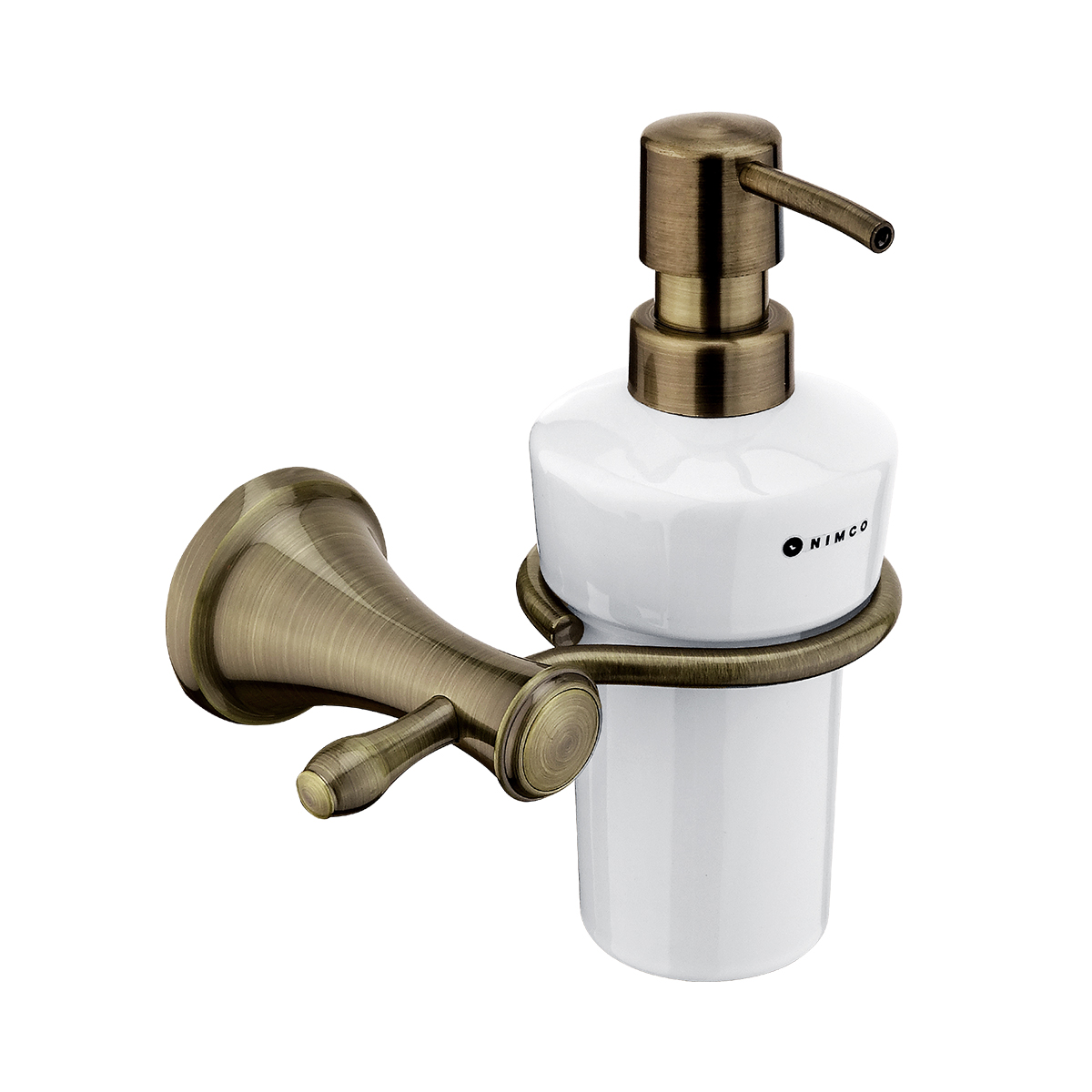 Soap dispenser. Ceramic container 300 ml. Brass holder. Plastic pump. Antique brass surface.