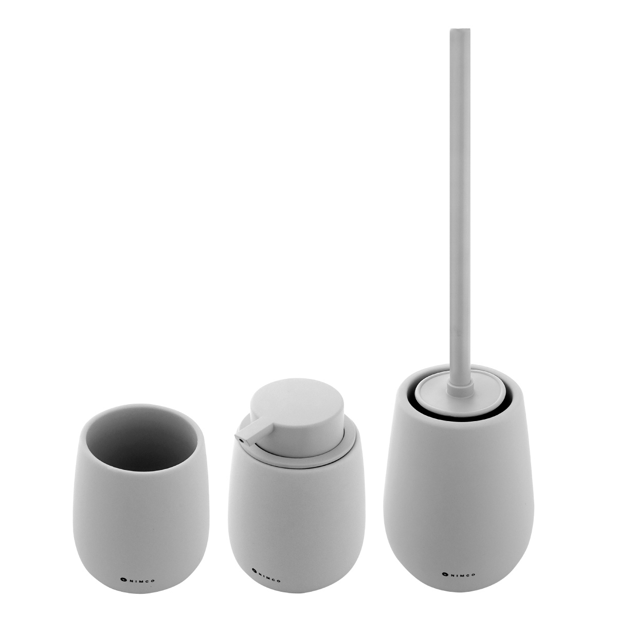 The set includes a liquid soap dispenser, a cup for toothbrushes and a toilet brush. Ceramic light gray matte containers. Volume 425 ml. Plastic pump. Stainless steel brush handle. Soft-touch Surface.