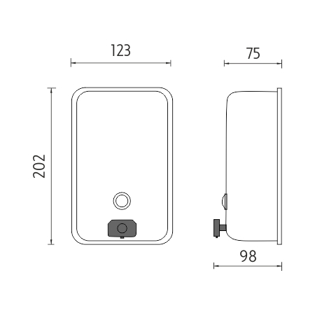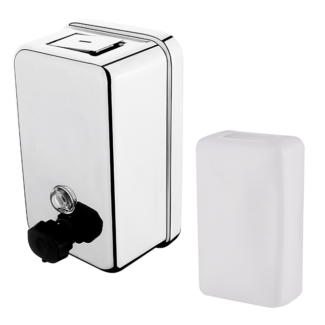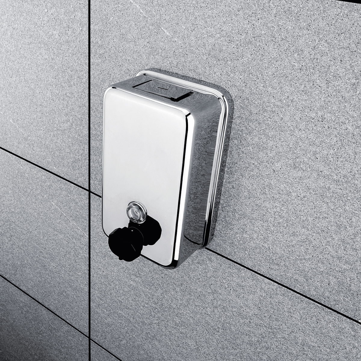 Soap or disinfectant gel dispenser - vertical. Polished stainless steel 18/8. Volume 1100 ml. Plastic pump - black.