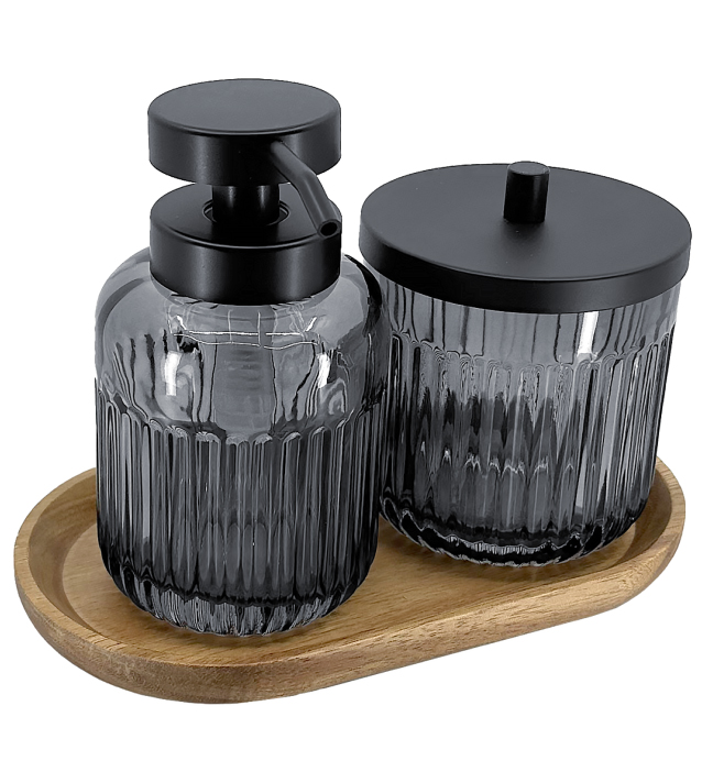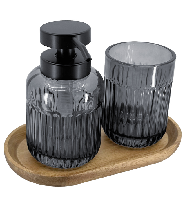 The TIMO series represents a harmony of elegance and functionality. The free-standing accessories made of black glass with delicate ribbing act as small design jewels for any bathroom. Their textured surface captures light and shadow, creating a unique play of reflections that adds depth and sophistication to the space.