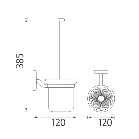 Toilet brush holder with satin glass container. Handle with chrome surface finish.