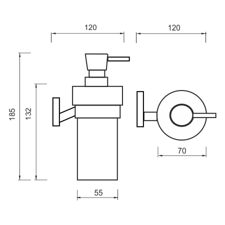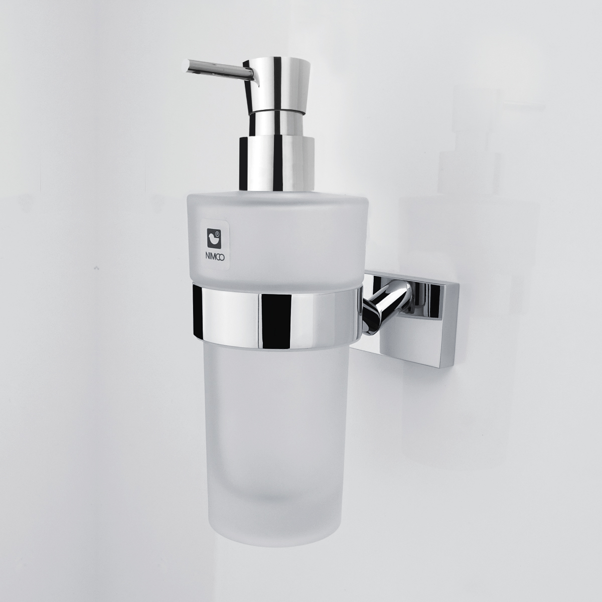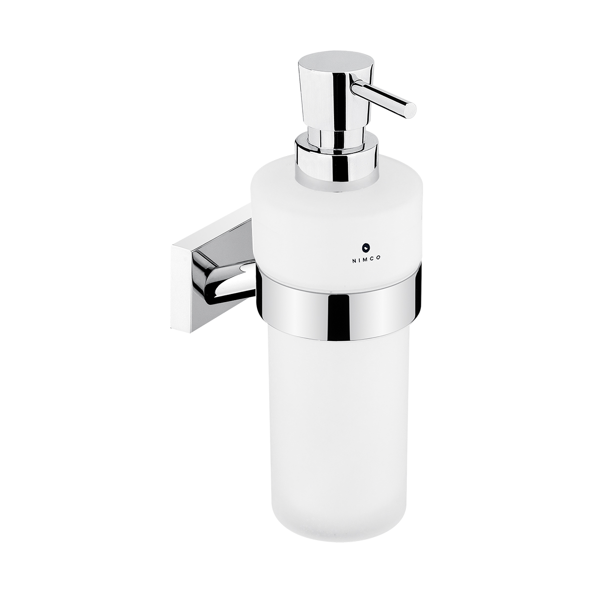 Nástěnný dávkovač na tekuté mýdlo. Nádobka z matného skla. Objem 250 ml. Pumpička mosaz / chrom.