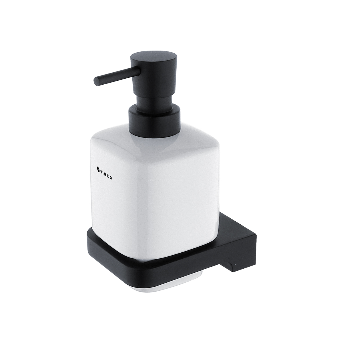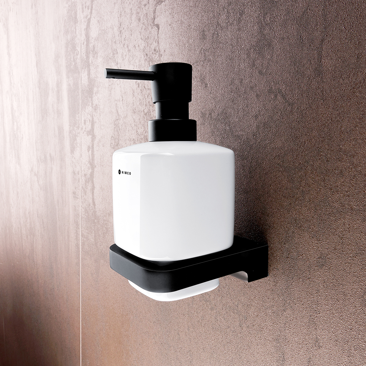 Nástěnný dávkovač na tekuté mýdlo o objemu 320 ml. Nádobka keramická. Pumpička mosaz/černý mat.