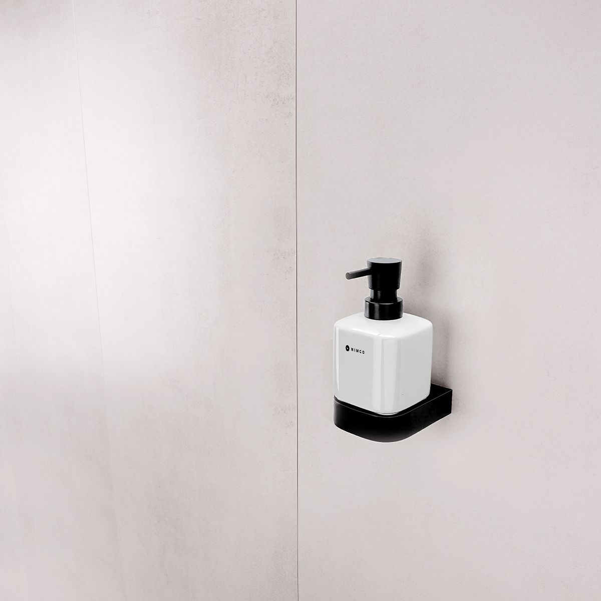 Nástěnný dávkovač na tekuté mýdlo o objemu 320 ml. Nádobka keramická. Pumpička mosaz/chrom.