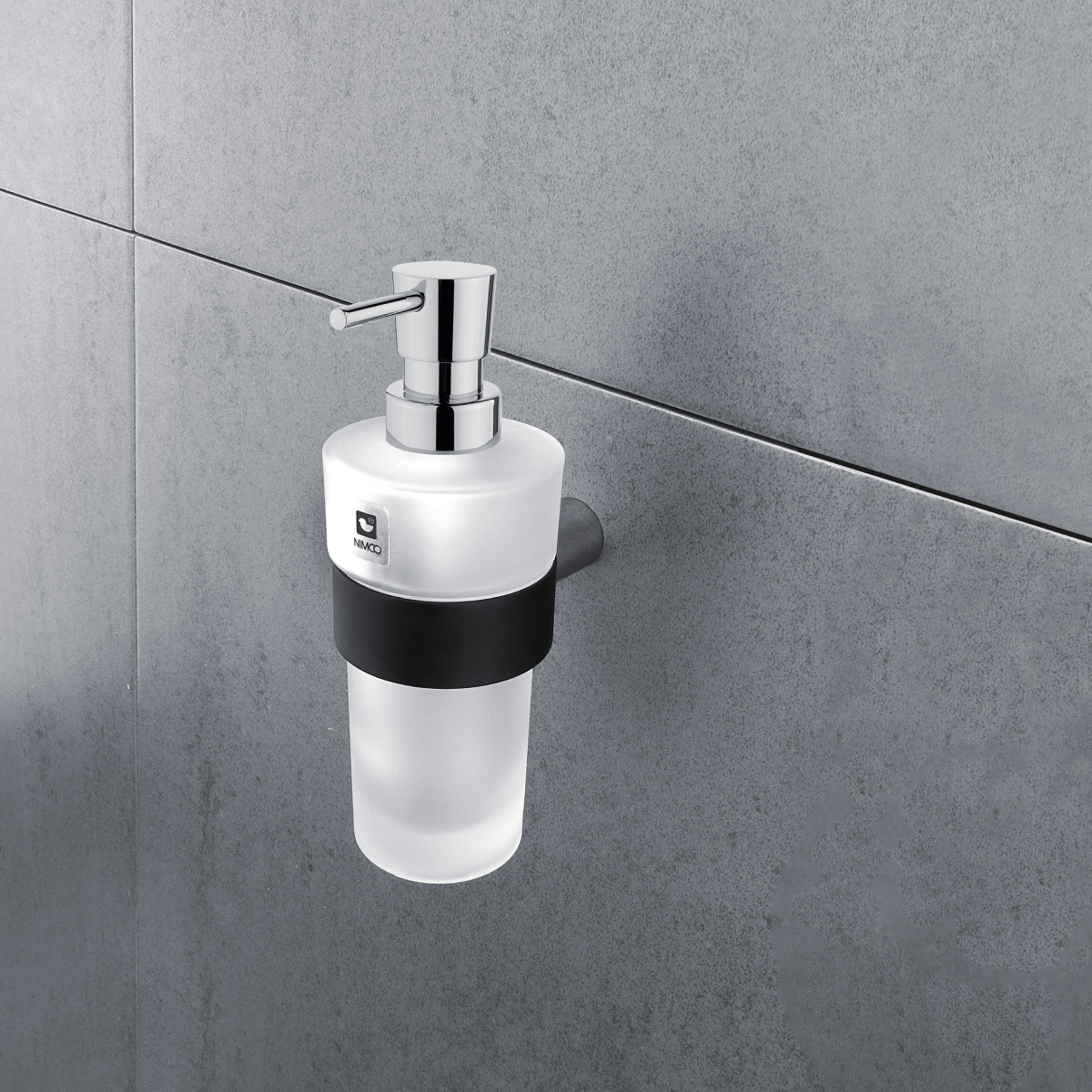 Nástěnný dávkovač tekutého mýdla z matného skla. Pumpička plast / chrom. Objem nádobky 250 ml.