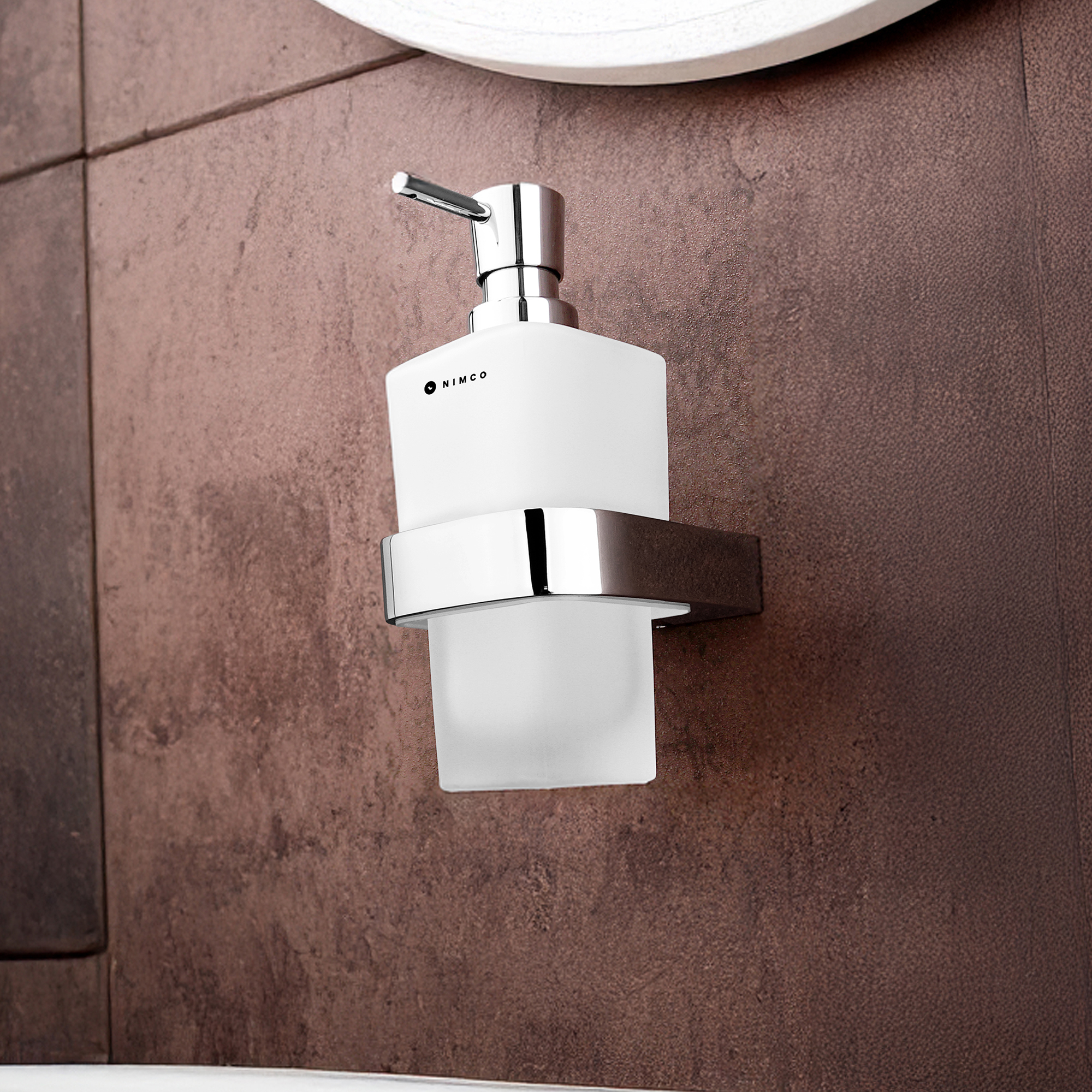 Nástěnný dávkovač na tekuté mýdlo o objemu 290 ml. Nádobka z matného skla. Pumpička plast/chrom.