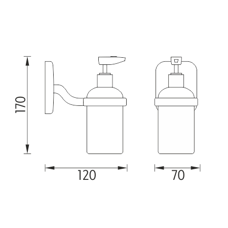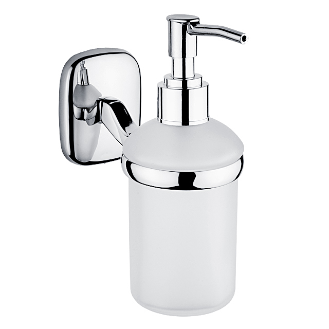 Nástěnný dávkovač tekutého mýdla. Pumpička plastová s povrch. úpravou chrom. Nádobka z matného skla.