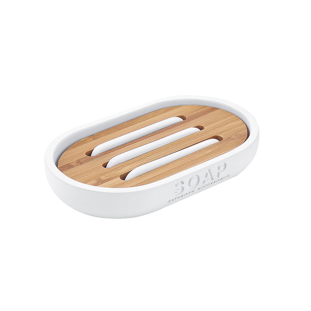 Mýdlenka. Barva bílá. Materiál polyresin, bambusové dřevo.