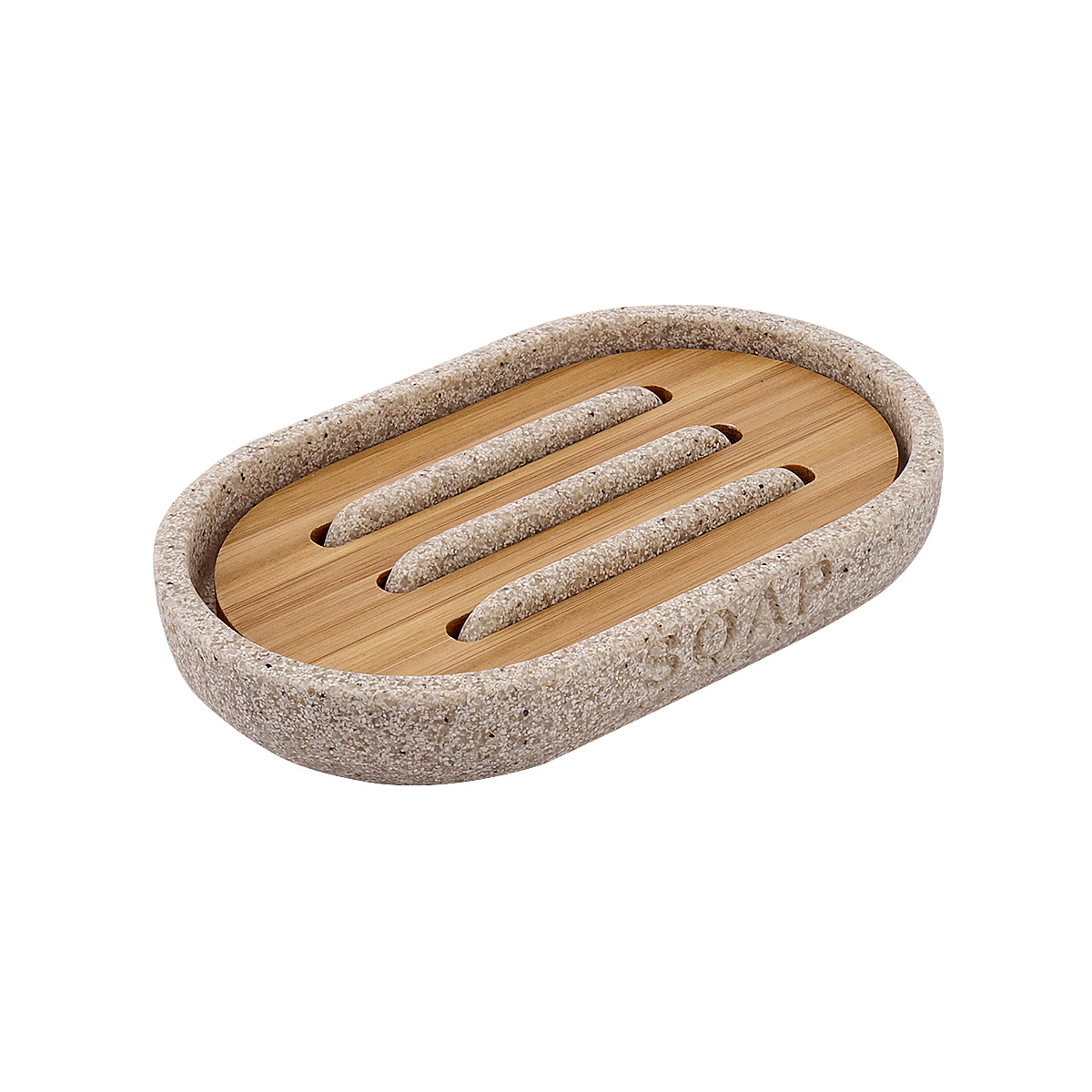Mýdlenka. Barva pískově béžová. Materiál polyresin, bambusové dřevo.
