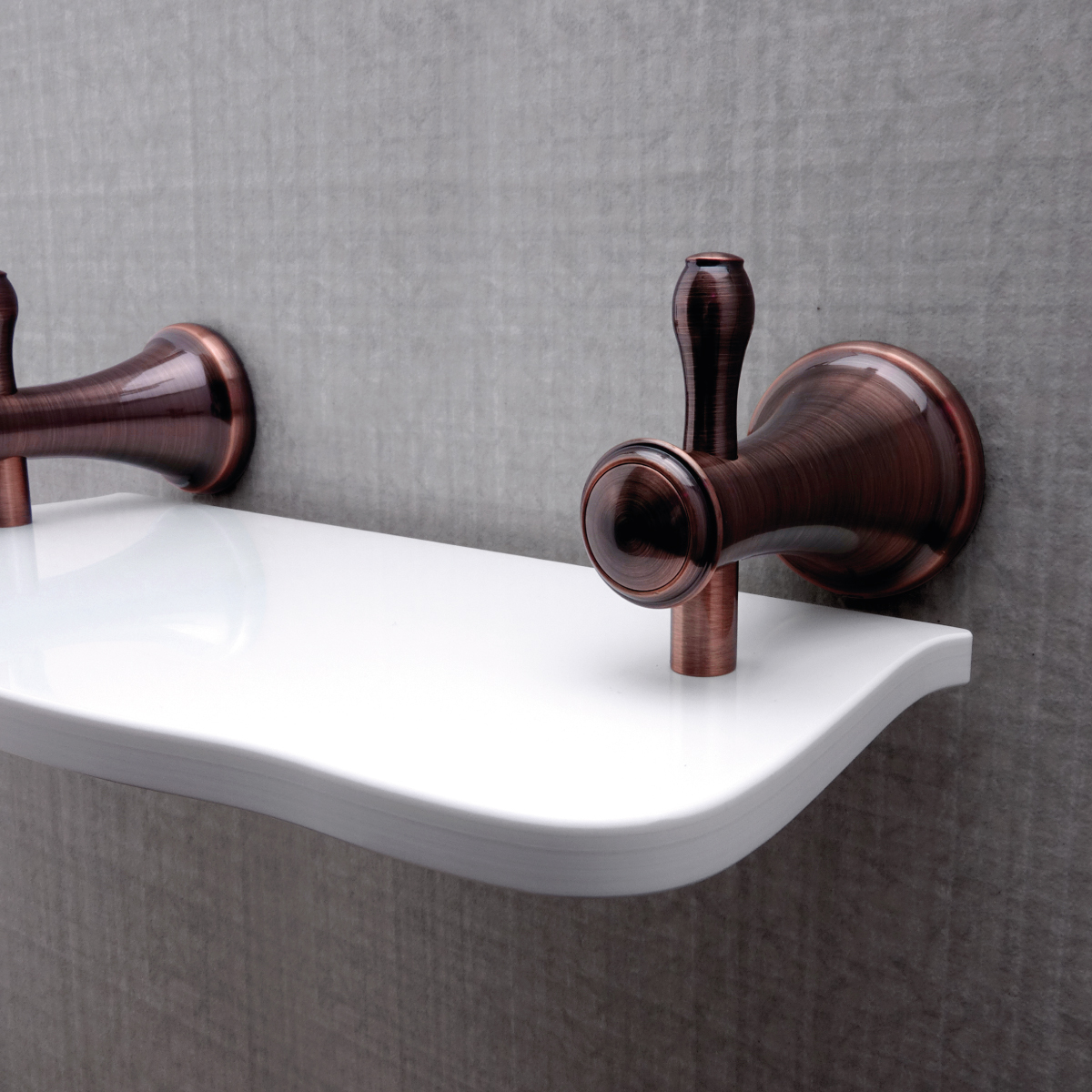 Police z bílého umělého kamene. Délka 40 cm. Úchyty mosaz s povrchovou úpravou staroměď.