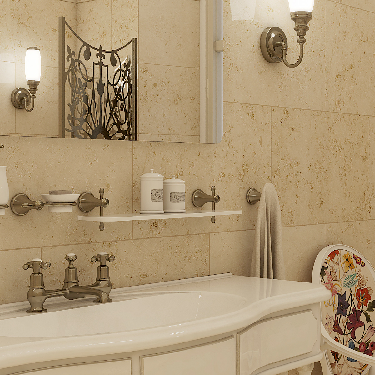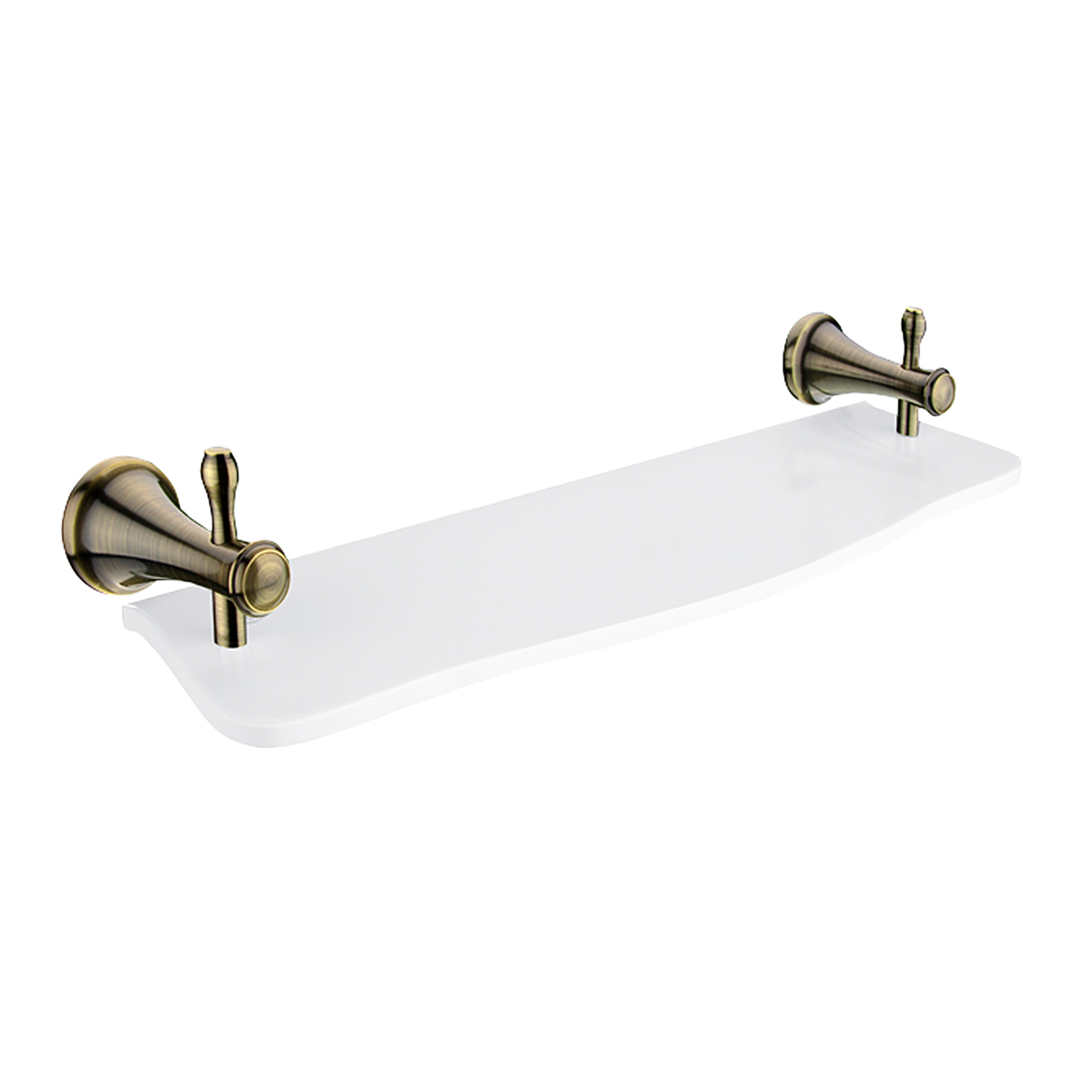 Police z bílého umělého kamene. Délka 50 cm. Úchyty mosaz s povrchovou úpravou staromosaz.