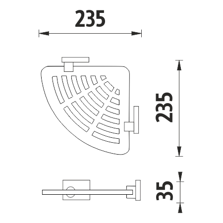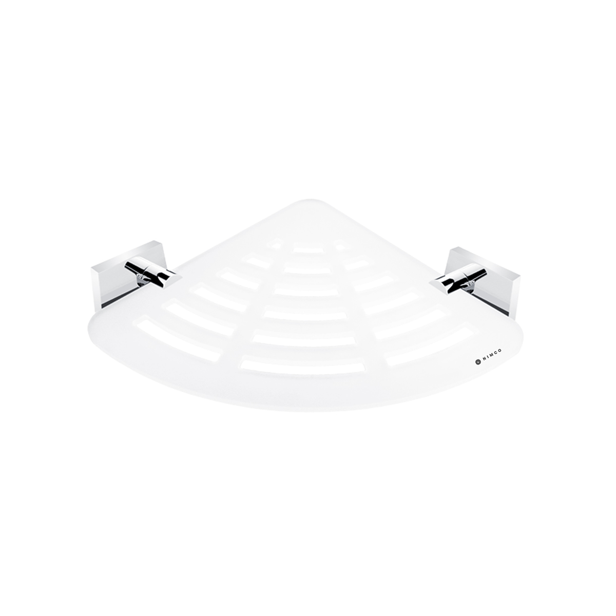 Rohová police plexiglass s frézováním. Úchyty mosaz / chrom. Rozměr 23,5x23,5 cm.