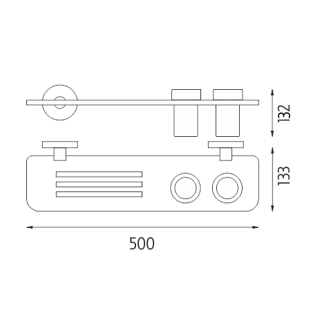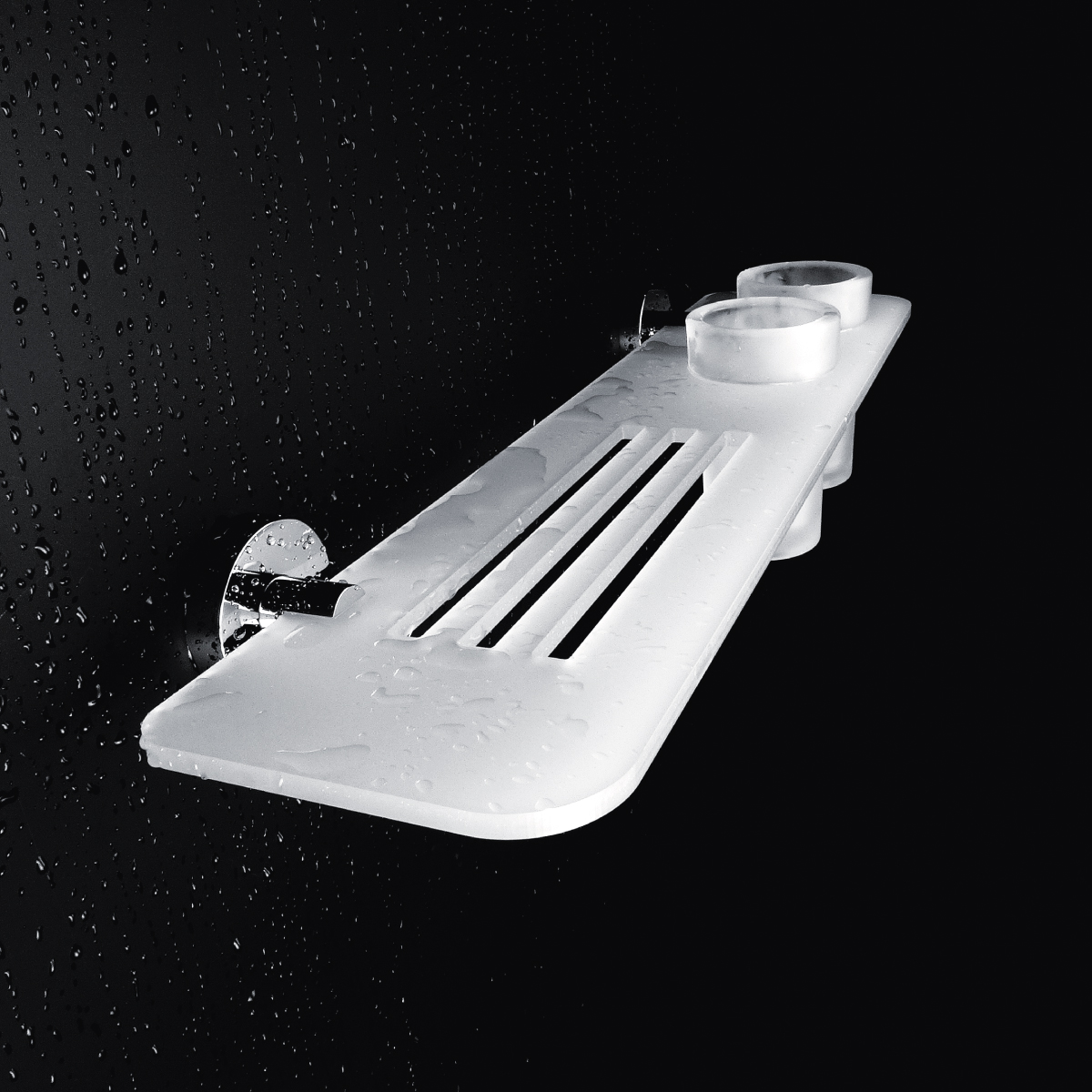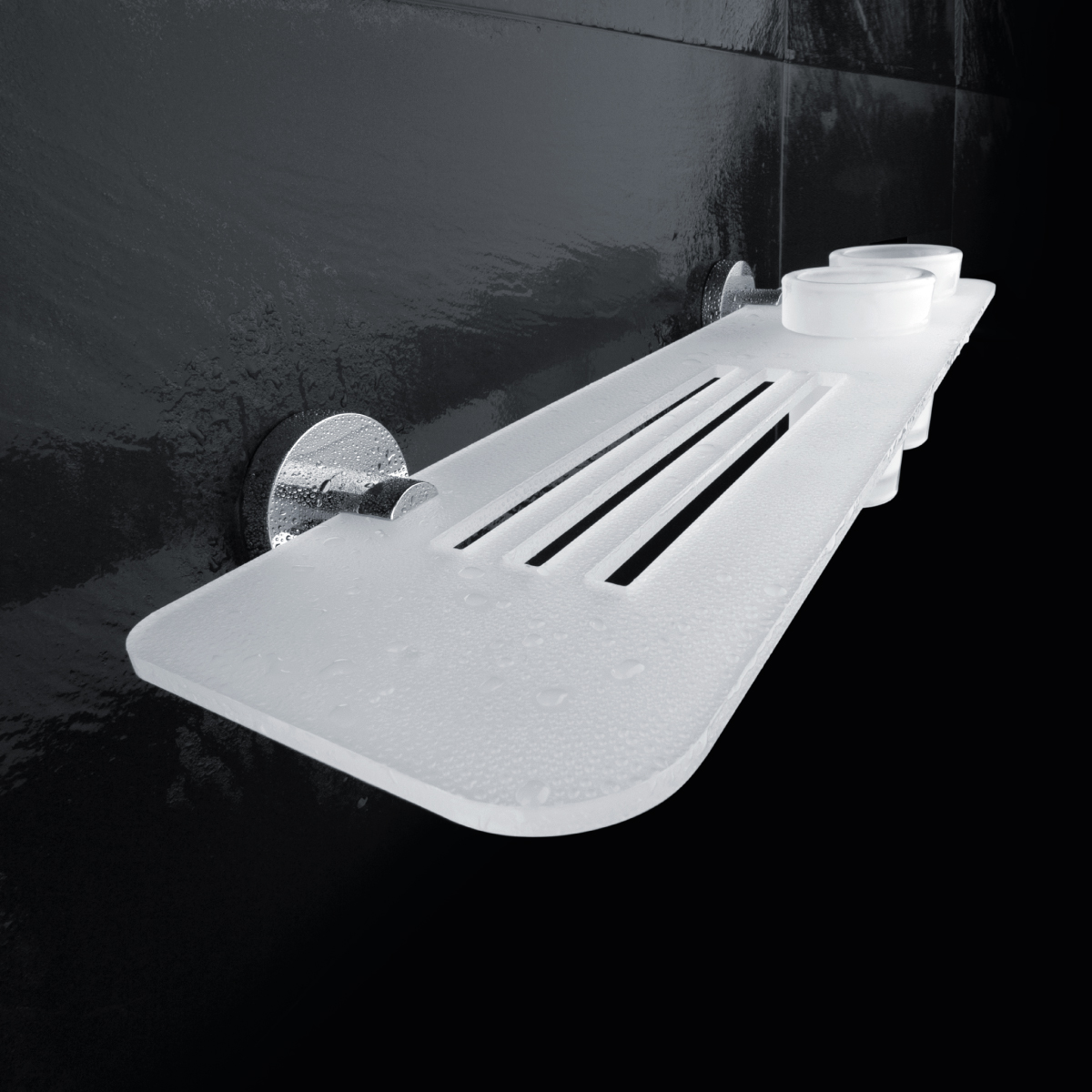 Police s frézovanými otvory s matnými sklenkami. Police plexiglass, délka 50 cm.