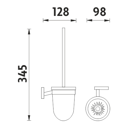 WC štětka. Nádobka nízká z matného skla. Úchyt mosaz s povrchovou úpravou chrom.