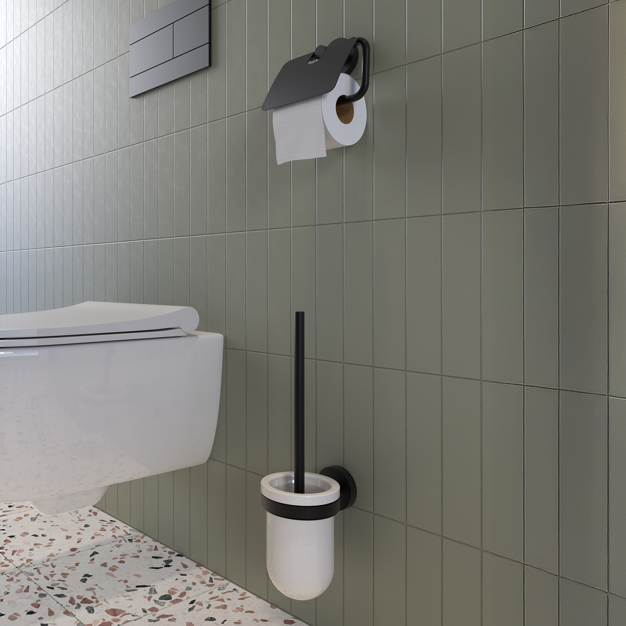 WC štětka s keramickou nízkou nádobkou. Rukojeť kartáče z mosazi s povrch. úpravou černá matná.