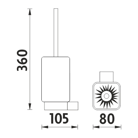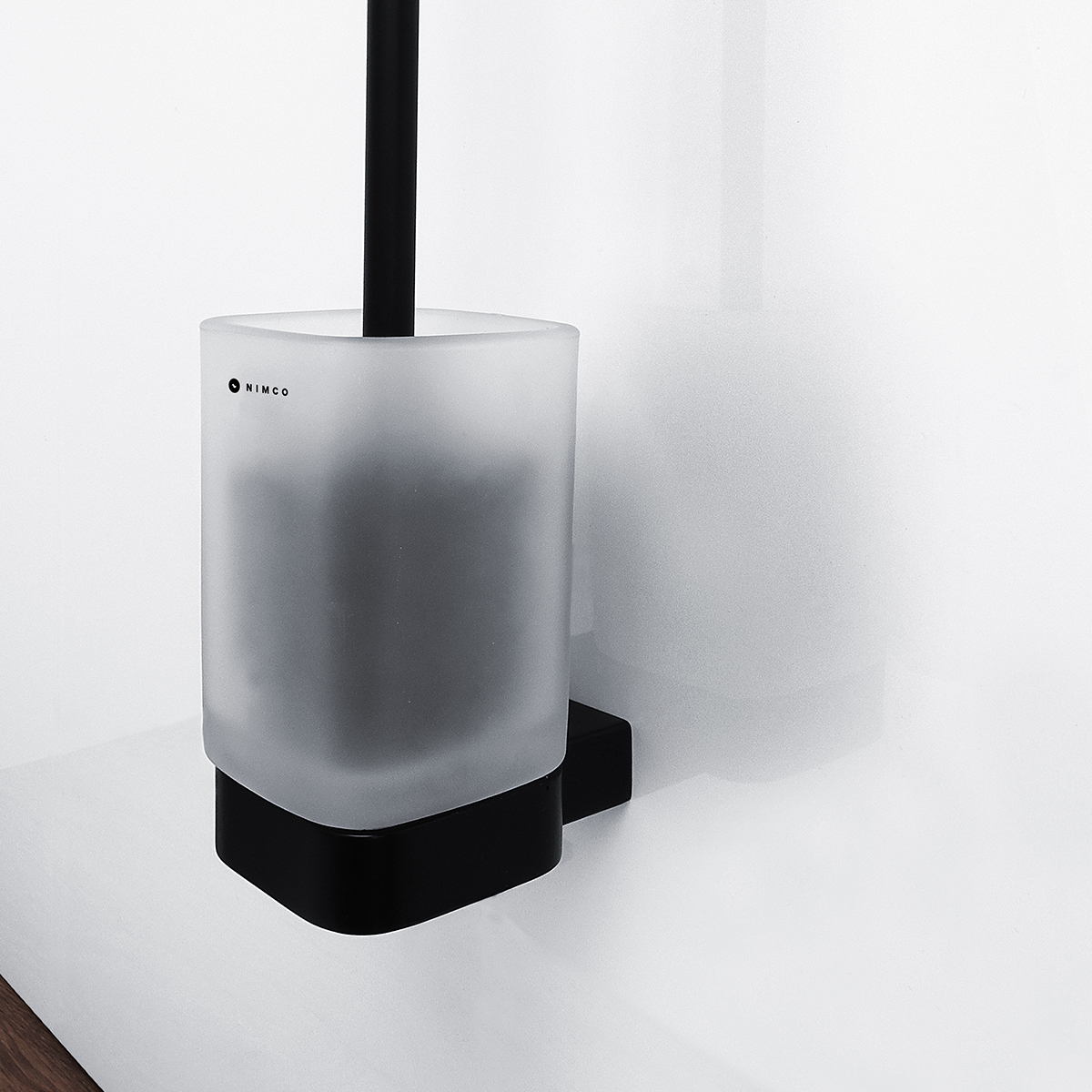 WC štětka s nádobkou z matného skla. Úchyt a rukojeť z mosazi, povrchová úprava černý mat.