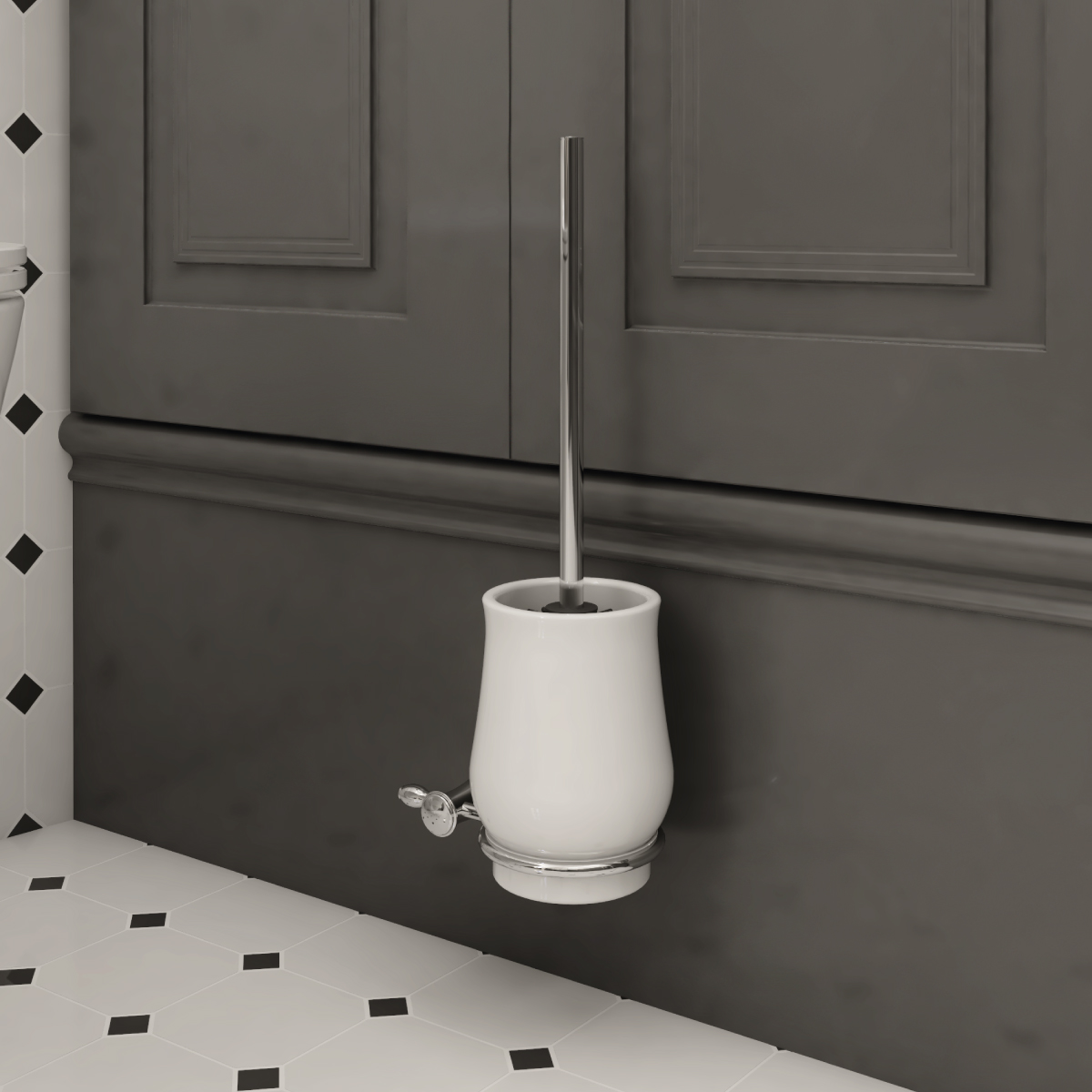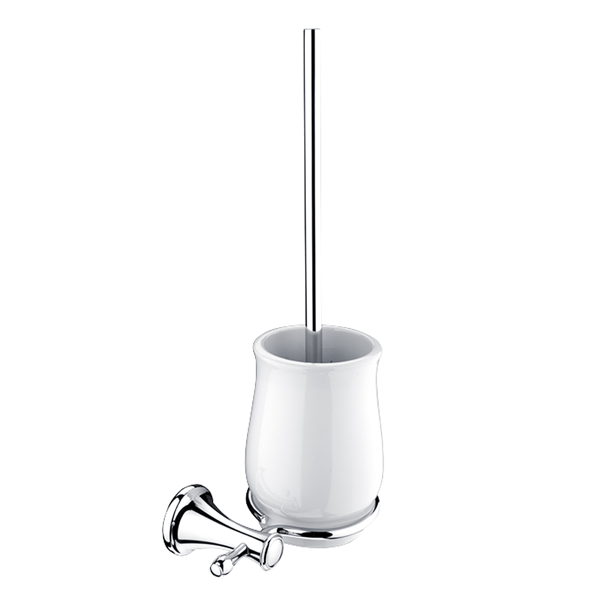WC štětka. Keramická nádobka. Materiál mosaz s povrchovou úpravou chrom.