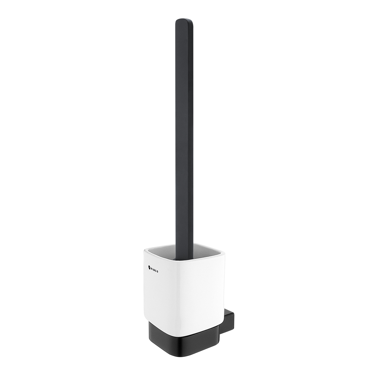 WC štětka s masivní hranatou rukojetí z mosazi, s keramickou nádobkou. Úchyt z mosazi, povrchová úprava černý mat.