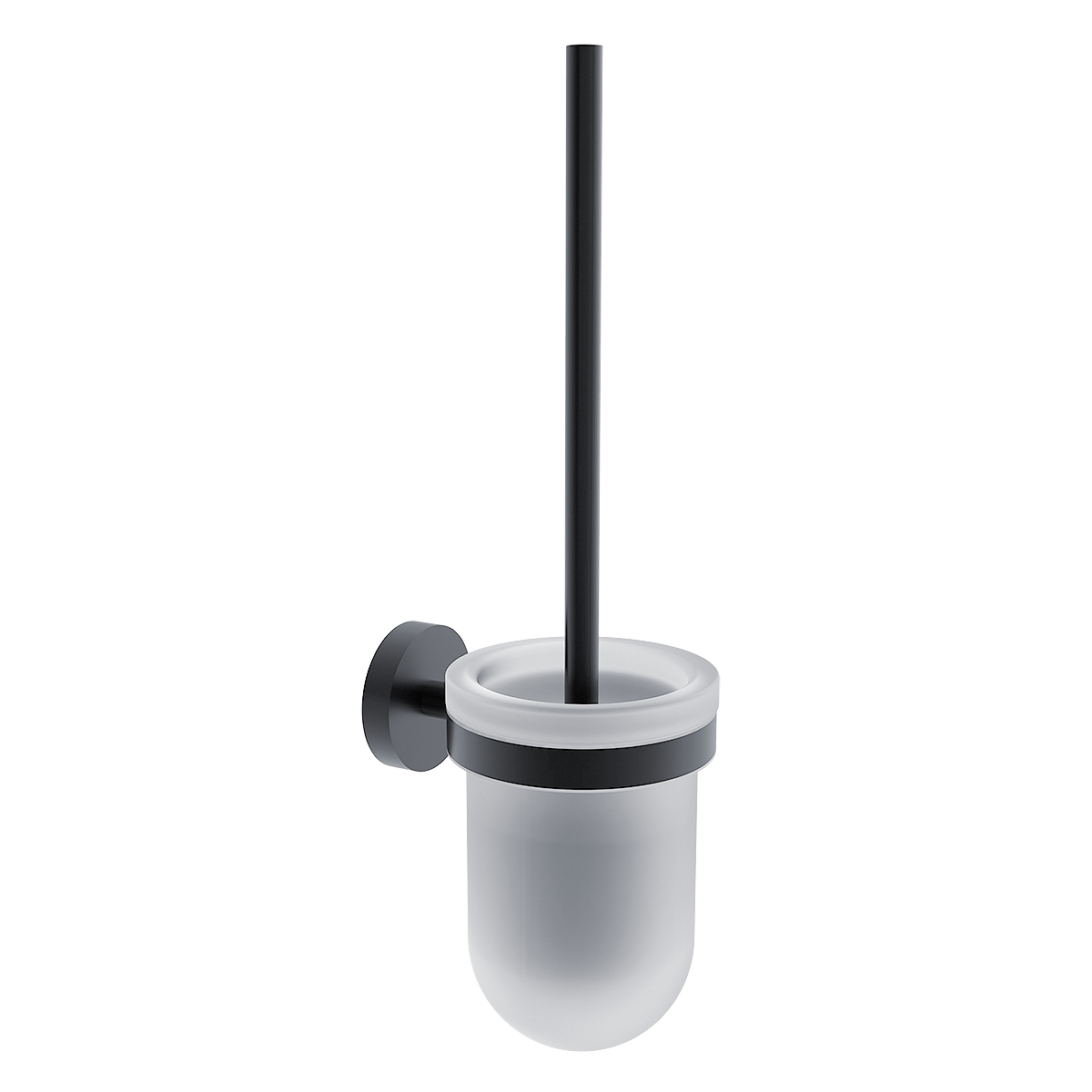 WC štětka. Nádobka nízká z matného skla. Rukojeť kartáče z mosazi s povrch. úpravou černá matná.
