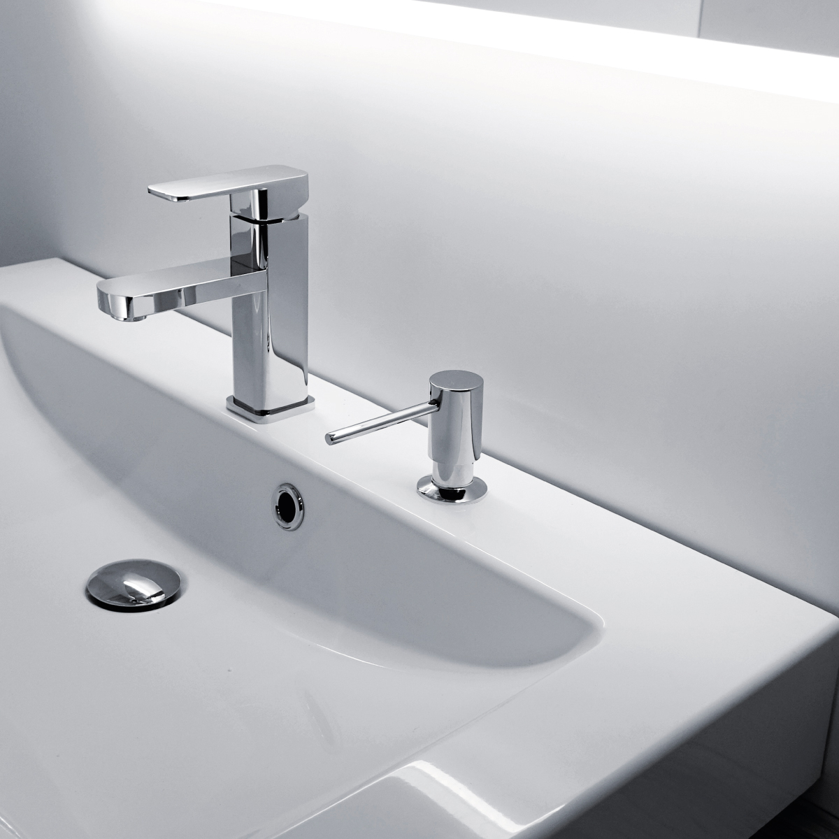 Vestavěný dávkovač na mýdlo, dezinfekční gel, prostředek k mytí nádobí. Hlava pumpy průměr 30 mm. Plnění nádobky shora vyjmutím pumpy.