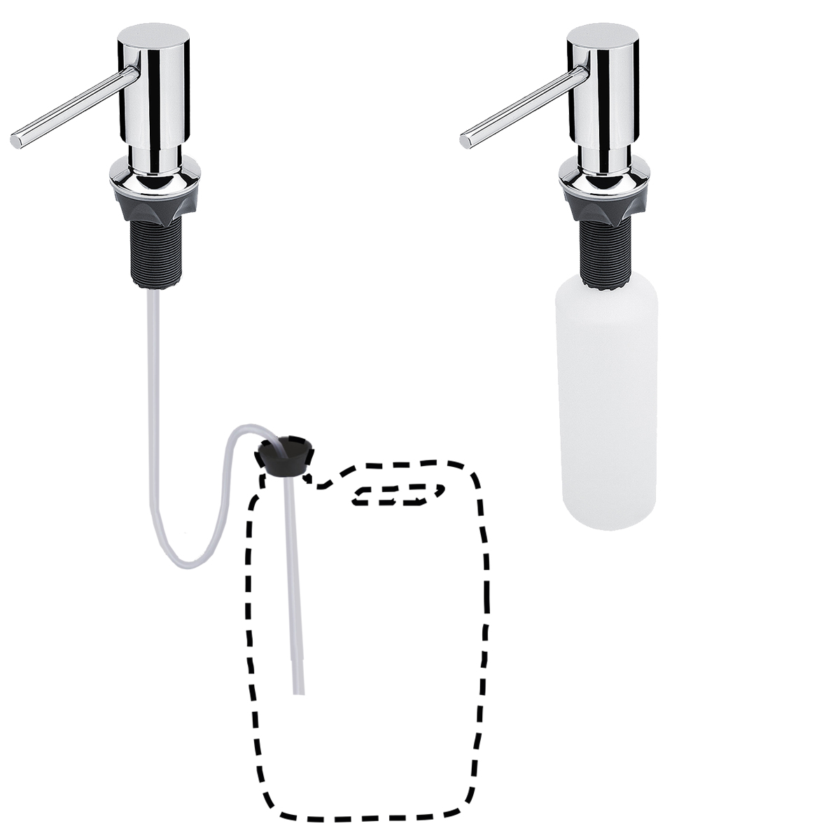 Vestavěný dávkovač na tekuté mýdlo, dezinfekční gel nebo prostředek k mytí nádobí. Hlava pumpy průměr 35 mm. Plnění 350 ml nádobky shora vyjmutím pumpy.