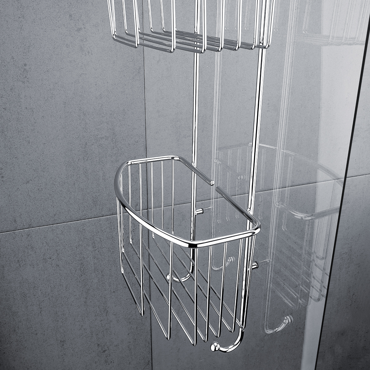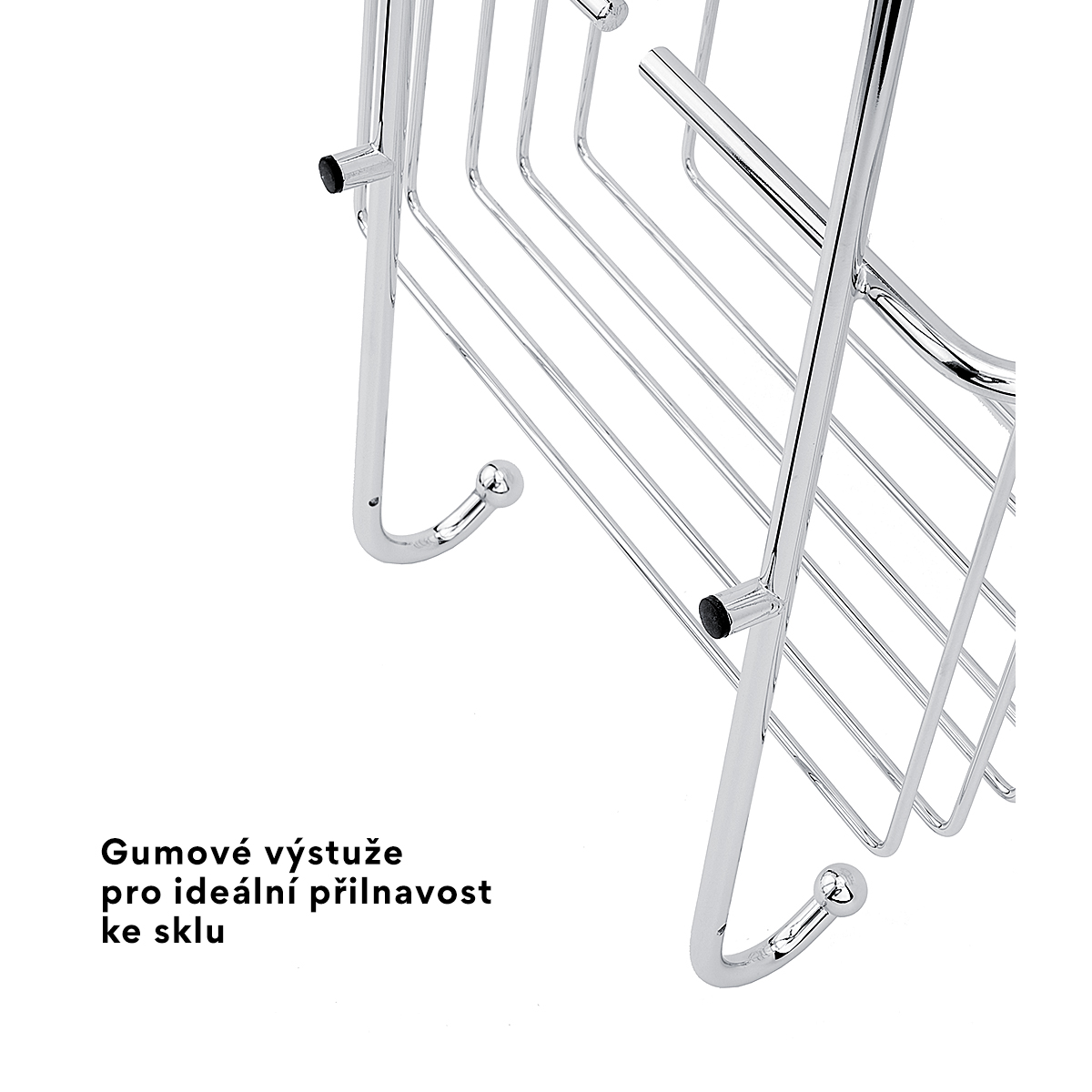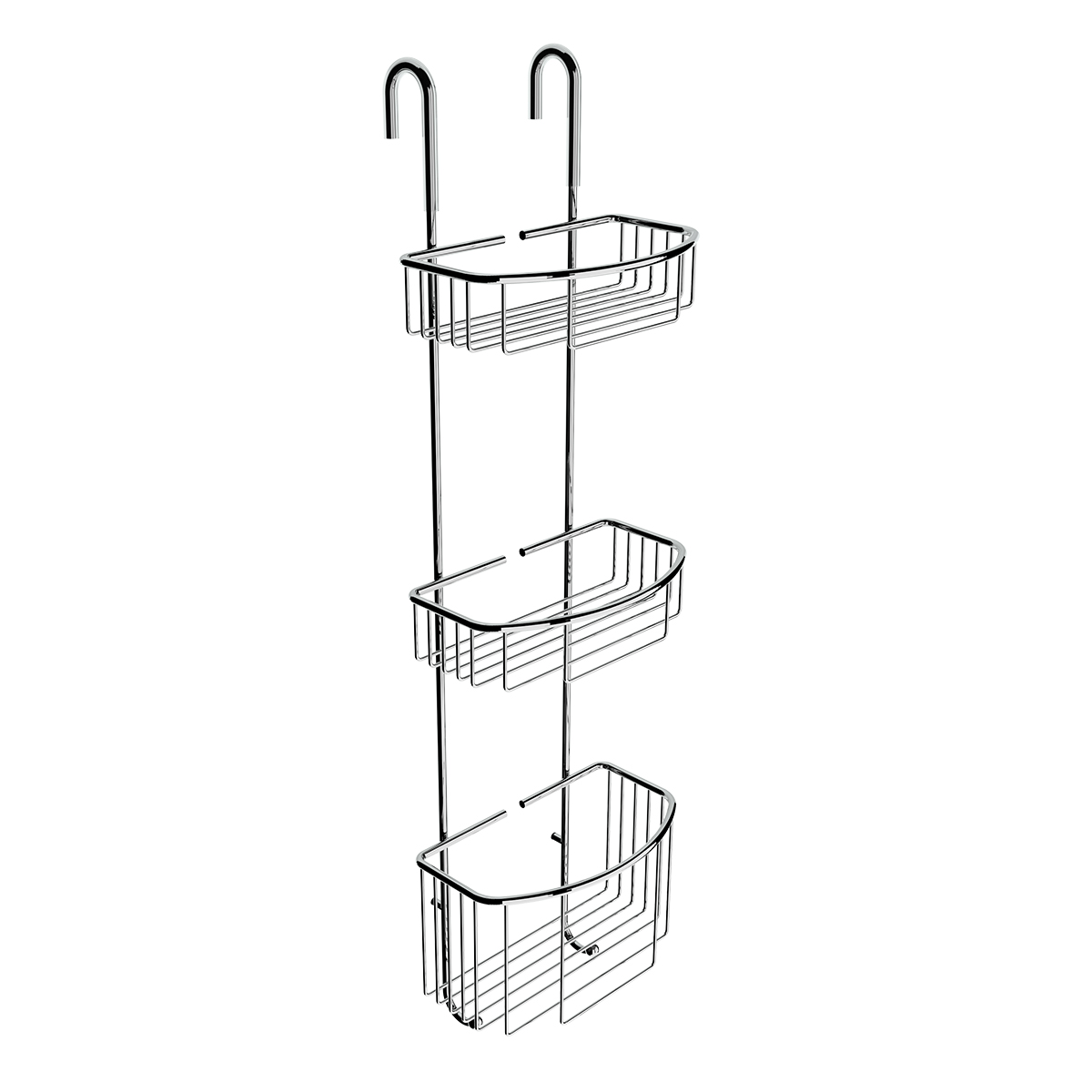 Drátěná police k zavěšení do sprchového koutu se třemi drátěnými koši.