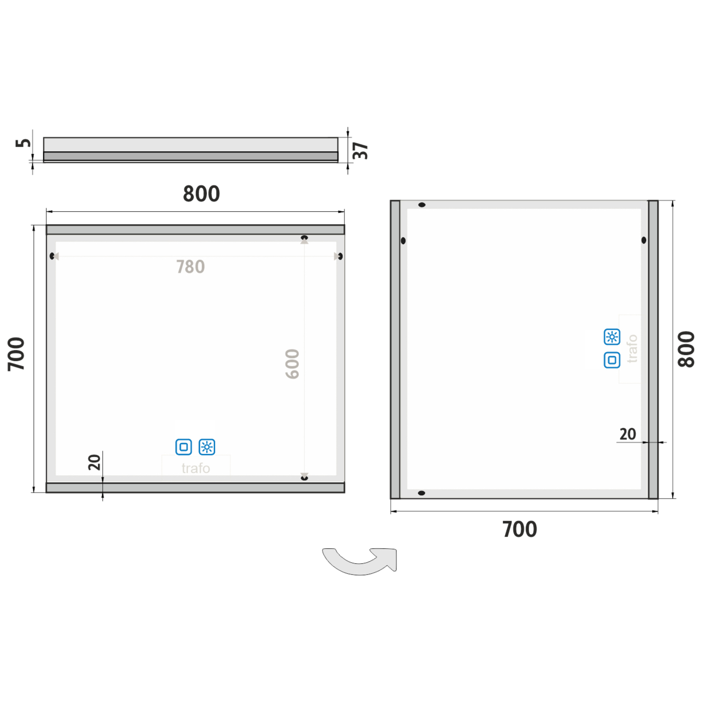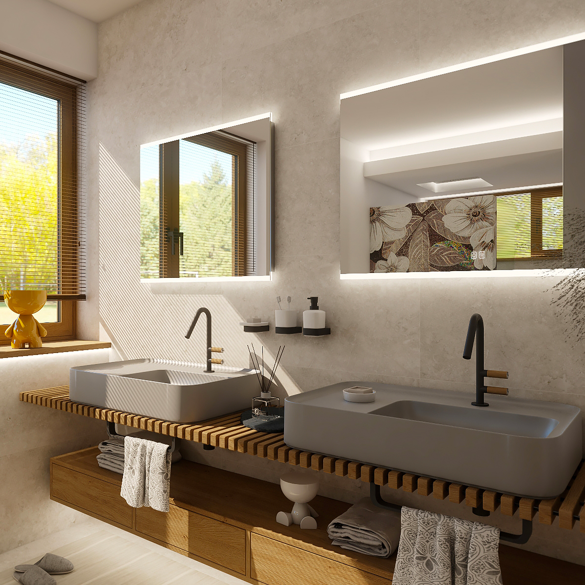 Illuminated bathroom LED mirror. Possibility of setting color temperature from 3000 to 6500 K. Output 24 W. 1728 Lumens.
