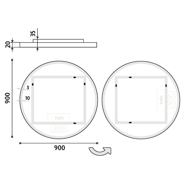 Ovládání: Dotykové senzory + možnost ovládání nástěnným vypínačem Nastavení barvy podsvícení: Ano Barva podsvícení: Nastavitelná v rozsahu 3000–6500 K (od teplé po studenou bílou) Funkce stmívání: Plynulé stmívání Paměť nastavení: Ano Konstrukce podsvícení: K rovnoměrnému rozptylu světla zrcadlo disponuje difuzorem z akrylového skla Integrace LED: LED diody jsou integrovány přímo v difuzoru LED čip: Nejmodernější LED čipy SMD 2835 LED pásek - hustota čipů: 192/m (96+96/m) Životnost LED čipů: Až 50 000 hodin Kvalita osvětlení LED: Survival Factor = 1; Lumen maintenance factor = 0,99; Flicker metric = 0,02 Materiál: Zrcadlové sklo, hliník Materiál konstrukce: Rám zrcadla a kryt zdroje jsou vyrobeny z hliníku Tloušťka skla: 5 mm Ochrana při rozbití: Bezpečnostní fólie Stupeň ochrany: IP 44 Certifikace: Český certifikát CE Umístění: Montáž na stěnu Možnost upevnění vertikálně i horizontálně Montážní příslušenství: Součástí balení je montážní sada a kabelová spojka s ochranou IP 44 Obal: Zabalené pro přepravu kurýrní službou Napětí: Vstupní napětí 220-240 V Výstupní napětí 12 V Příkon: 43 W, světelný tok: 3096 lm Rozměr: v: 900 mm š: 35 mm d: 900 mm Hmotnost: 12,6 kg M A T E R I Á L & F U N K Č N Í P A R A M E T R Y
