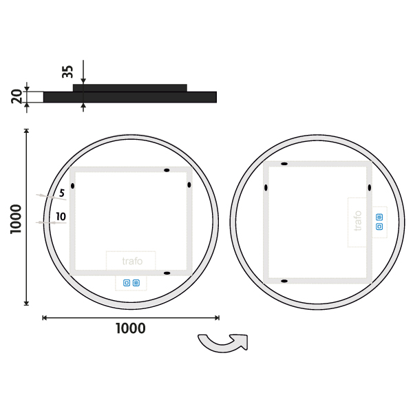 Ovládání: Dotykové senzory + možnost ovládání nástěnným vypínačem Nastavení barvy podsvícení: Ano Barva podsvícení: Nastavitelná v rozsahu 3000–6500 K (od teplé po studenou bílou) Funkce stmívání: Plynulé stmívání Paměť nastavení: Ano Konstrukce podsvícení: K rovnoměrnému rozptylu světla zrcadlo disponuje difuzorem z akrylového skla Integrace LED: LED diody jsou integrovány přímo v difuzoru LED čip: Nejmodernější LED čipy SMD 2835 LED pásek - hustota čipů: 192/m (96+96/m) Životnost LED čipů: Až 50 000 hodin Kvalita osvětlení LED: Survival Factor = 1; Lumen maintenance factor = 0,99; Flicker metric = 0,02 Materiál: Zrcadlové sklo, hliník Materiál konstrukce: Rám zrcadla a kryt zdroje jsou vyrobeny z hliníku Tloušťka skla: 5 mm Ochrana při rozbití: Bezpečnostní fólie Stupeň ochrany: IP 44 Certifikace: Český certifikát CE Umístění: Montáž na stěnu Možnost upevnění vertikálně i horizontálně Montážní příslušenství: Součástí balení je montážní sada a kabelová spojka s ochranou IP 44 Obal: Zabalené pro přepravu kurýrní službou Napětí: Vstupní napětí 220-240 V Výstupní napětí 12 V Příkon: 47 W, světelný tok: 3384 lm Rozměr: v: 1000 mm š: 35 mm d: 1000 mm Hmotnost: 15,6 kg M A T E R I Á L & F U N K Č N Í P A R A M E T R Y