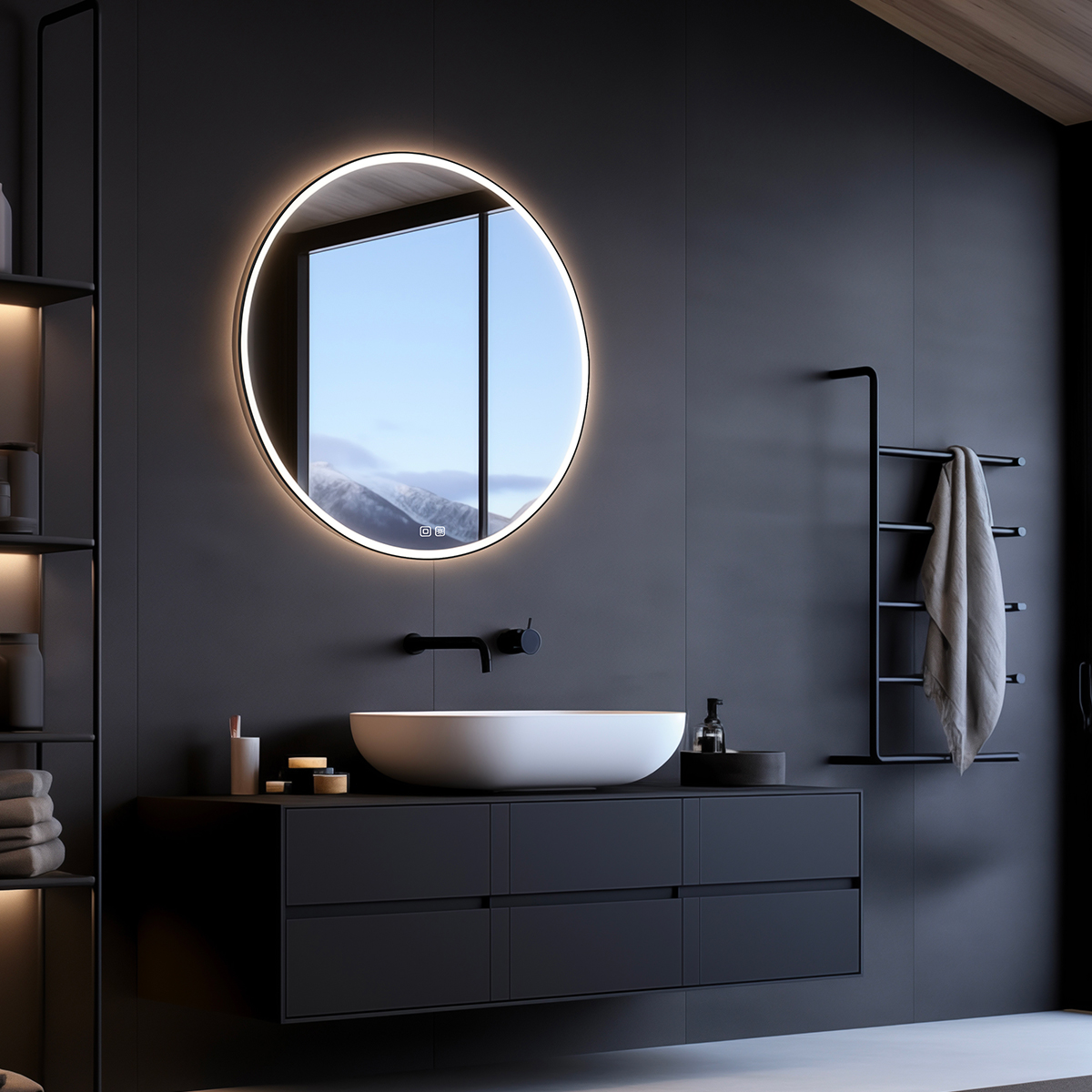 Kulaté zrcadlo s rámem a s celoobvodovým podsvícením pro dokonalé a rovnoměrné osvětlení.
