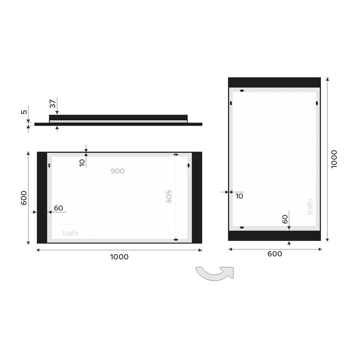 - Konstrukce podsvícení: K rovnoměrnému rozptylu světla zrcadlo disponuje akrylovým matovaným difuzorem