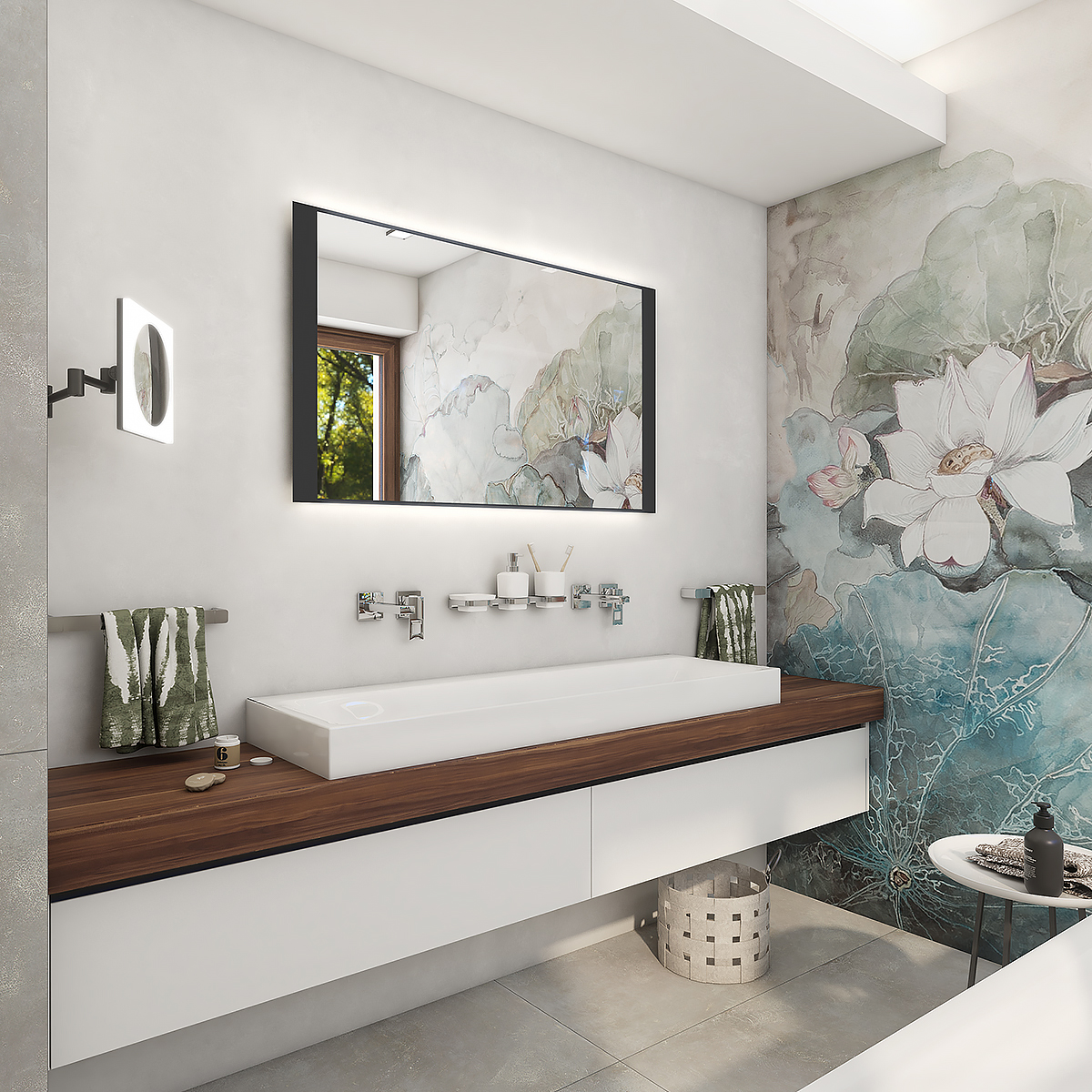 Pro dosažení kvalitního a rovnoměrného podsvícení je použit akrylový difuzor, který zajišťuje měkký a harmonický rozptyl světla bez viditelných bodových zdrojů. LED diody jsou vkusně integrovány do rámu spolu s difuzorem, což přispívá k elegantnímu a čistému vzhledu zrcadla.