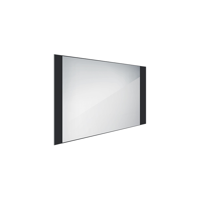 Obdélníkové zrcadlo s rámem s ostrými rohy a podsvícením ze spodu a shora pro rovnoměrné a stylové osvětlení.