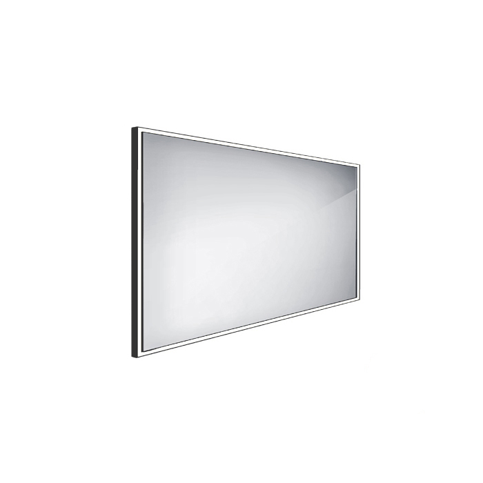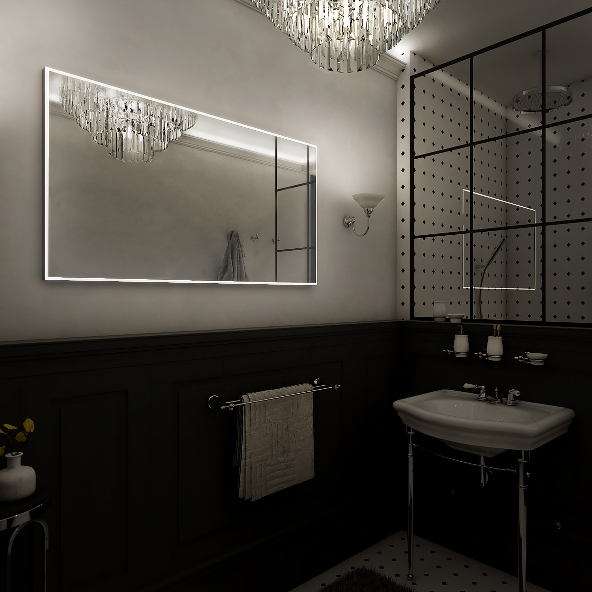 Obdélníkové zrcadlo s rámem s ostrými rohy a celoobvodovým svícením pro dokonalé a rovnoměrné osvětlení.