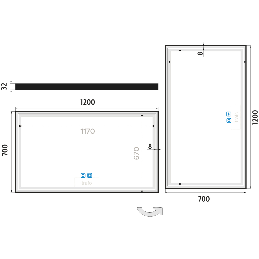 Pro dosažení kvalitního a rovnoměrného svícení je použit akrylový difuzor, který zajišťuje měkký a harmonický rozptyl světla bez viditelných bodových zdrojů. LED diody jsou vkusně integrovány do rámu spolu s difuzorem, což přispívá k elegantnímu a čistému vzhledu zrcadla.