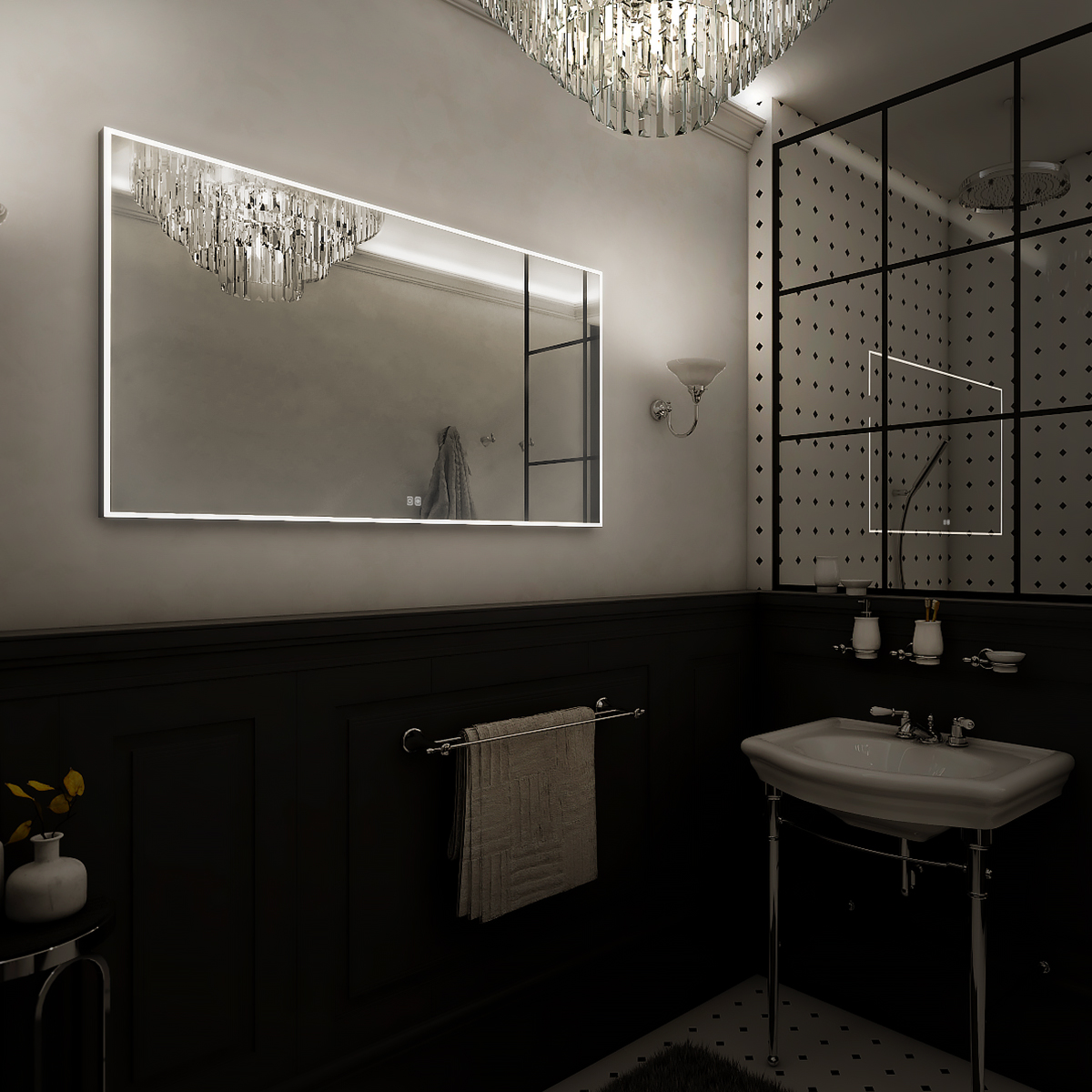 Obdélníkové zrcadlo s rámem s ostrými rohy a celoobvodovým svícením pro dokonalé a rovnoměrné osvětlení.