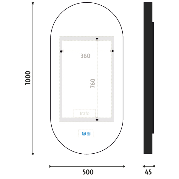 Ovládání: Dotykové senzory + možnost ovládání nástěnným vypínačem Nastavení barvy světla: Ano Barva světla: Nastavitelná v rozsahu 3000–6500 K (od teplé po studenou bílou) Funkce stmívání: Plynulé stmívání Paměť nastavení: Automatická paměť nastavení Konstrukce svícení: K rovnoměrnému rozptylu světla zrcadlo disponuje akrylovým matovaným difuzorem Integrace LED: Led diody jsou zabudované v rámu LED čip: Nejmodernější LED čipy SMD 2835 LED pásek - hustota čipů: 2-in-1 120/m (240/m) Životnost LED čipů: Až 50 000 hodin Kvalita osvětlení LED: Survival Factor = 1; Lumen maintenance factor = 0,99; Flicker metric = 0,02 Materiál: Zrcadlové sklo, hliník Materiál konstrukce: Rám zrcadla a kryt zdroje jsou vyrobeny z hliníku Tloušťka skla: 5 mm Ochrana při rozbití: Bezpečnostní fólie Stupeň ochrany: IP 44 Certifikace: Český certifikát CE Umístění: Montáž na stěnu Možnost upevnění vertikálně i horizontálně Montážní příslušenství: Součástí balení je montážní sada a kabelová spojka s ochranou IP 44 Obal: Zabalené pro přepravu kurýrní službou Napětí: Vstupní napětí 220-240 V Výstupní napětí 12 V Příkon: 31 W, světelný tok: 2232 lm Rozměr: v: 1000 mm š: 50 mm d: 500 mm Hmotnost: 8,1 kg M A T E R I Á L & F U N K Č N Í P A R A M E T R Y