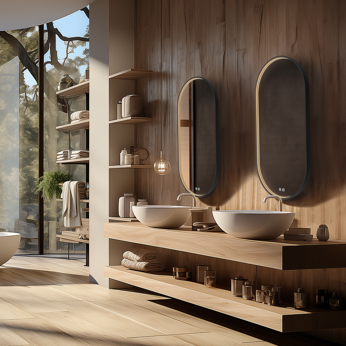 Oválné zrcadlo s rámem a s celoobvodovým svícením pro dokonalé a rovnoměrné osvětlení.
