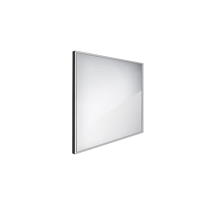 Obdélníkové zrcadlo s rámem s ostrými rohy a celoobvodovým svícením pro dokonalé a rovnoměrné osvětlení.