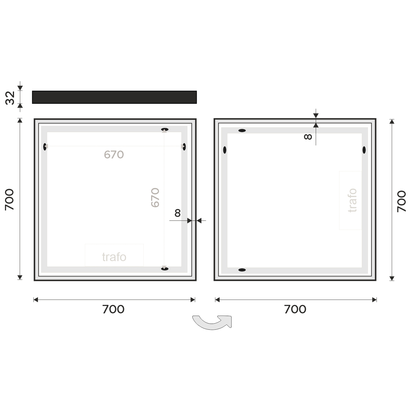 Pro dosažení kvalitního a rovnoměrného svícení je použit akrylový difuzor, který zajišťuje měkký a harmonický rozptyl světla bez viditelných bodových zdrojů. LED diody jsou vkusně integrovány do rámu spolu s difuzorem, což přispívá k elegantnímu a čistému vzhledu zrcadla.
