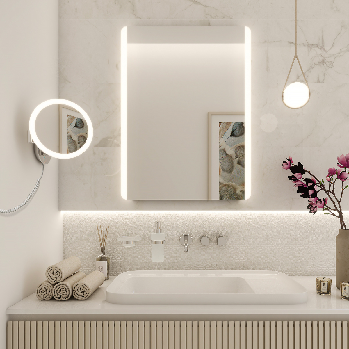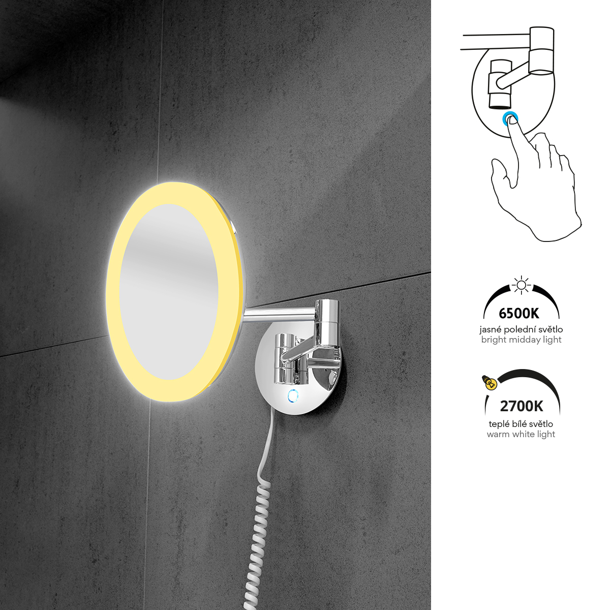 LED zvětšovací zrcátko s dotykovým podsvíceným senzorem s nast.teplotou chromatičnosti 6500 / 2700 K. Zvětšení 5x.